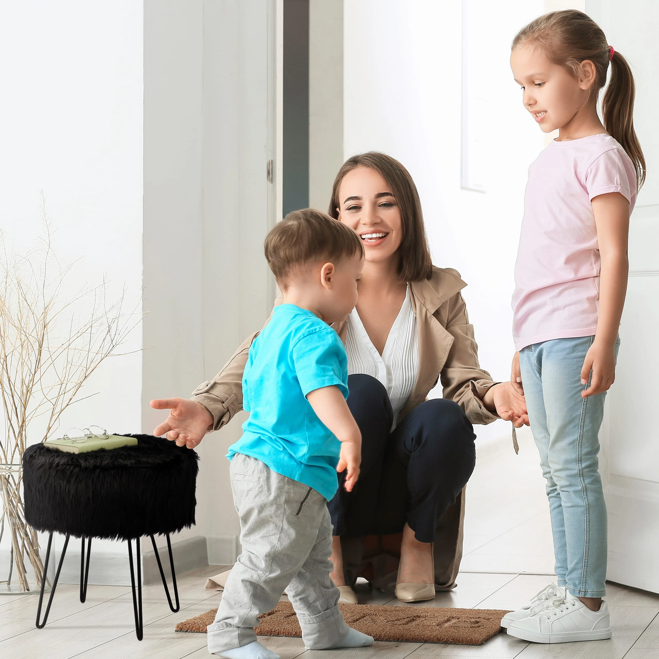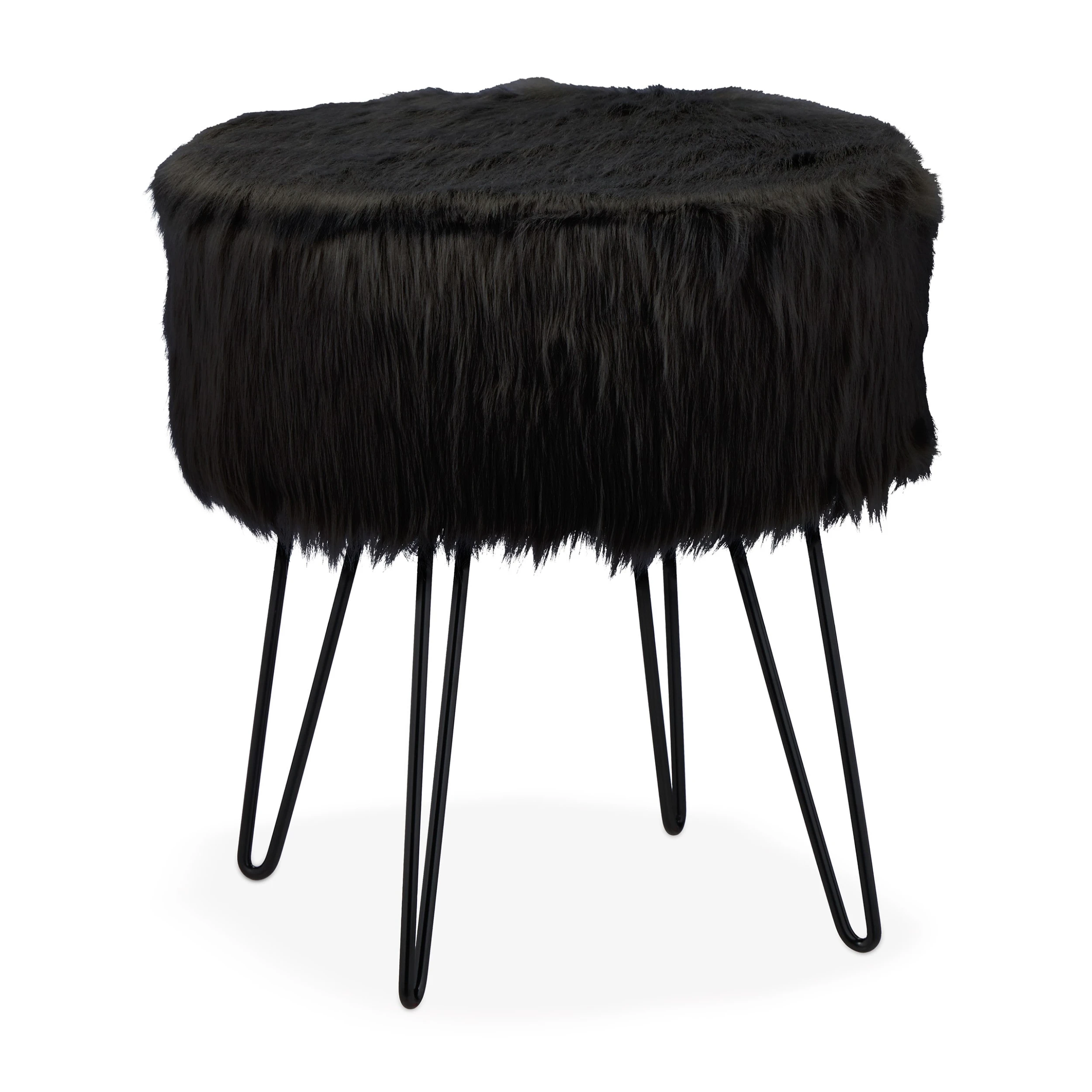 Dieser elegante und belastbare Sitzhocker ist ein dekoratives Möbelstück für Deinen Wohnraum. Ob neben der Couch im Wohnzimmer, im Flur oder vor dem Schminktisch, der Plüschhocker ist vielseitig platzierbar. Das kuschelige Kunstfell und die weiche Polsterung machen den Sofahocker zu einer gemütlichen Sitzgelegenheit. Dabei überzeugt der schwarze Couchhocker optisch mit seinem glänzenden Bezug und den Haarnadelbeinen aus Metall als Kontrast.