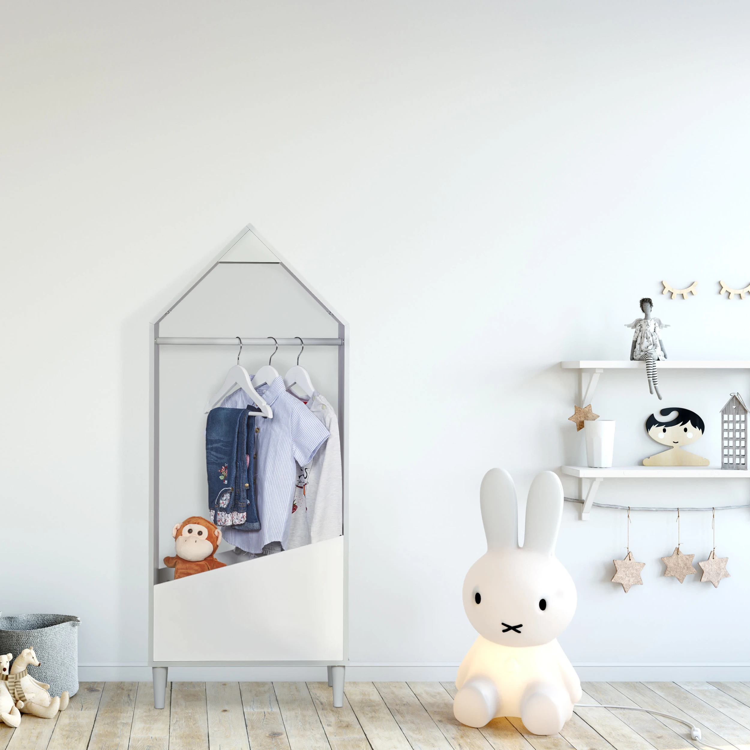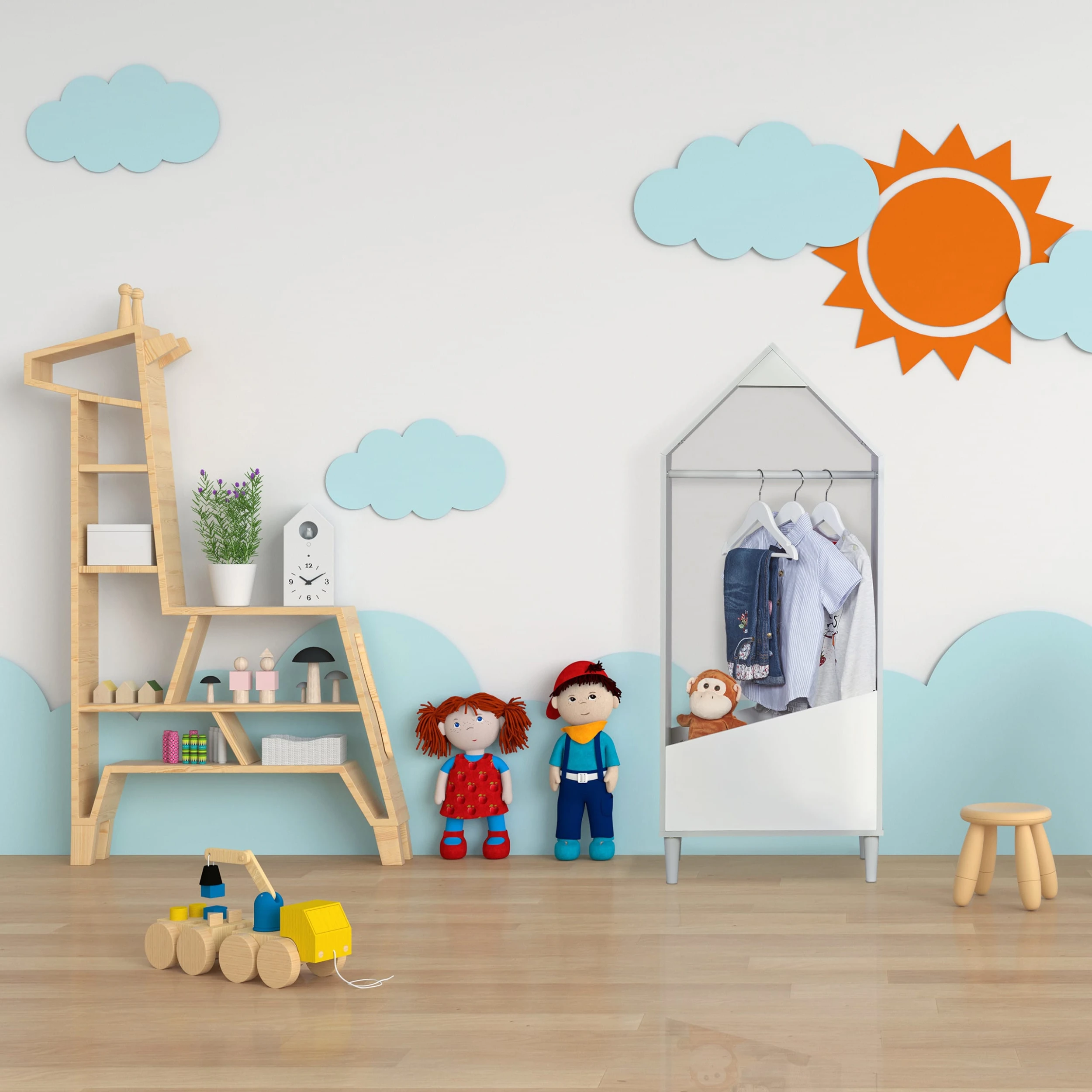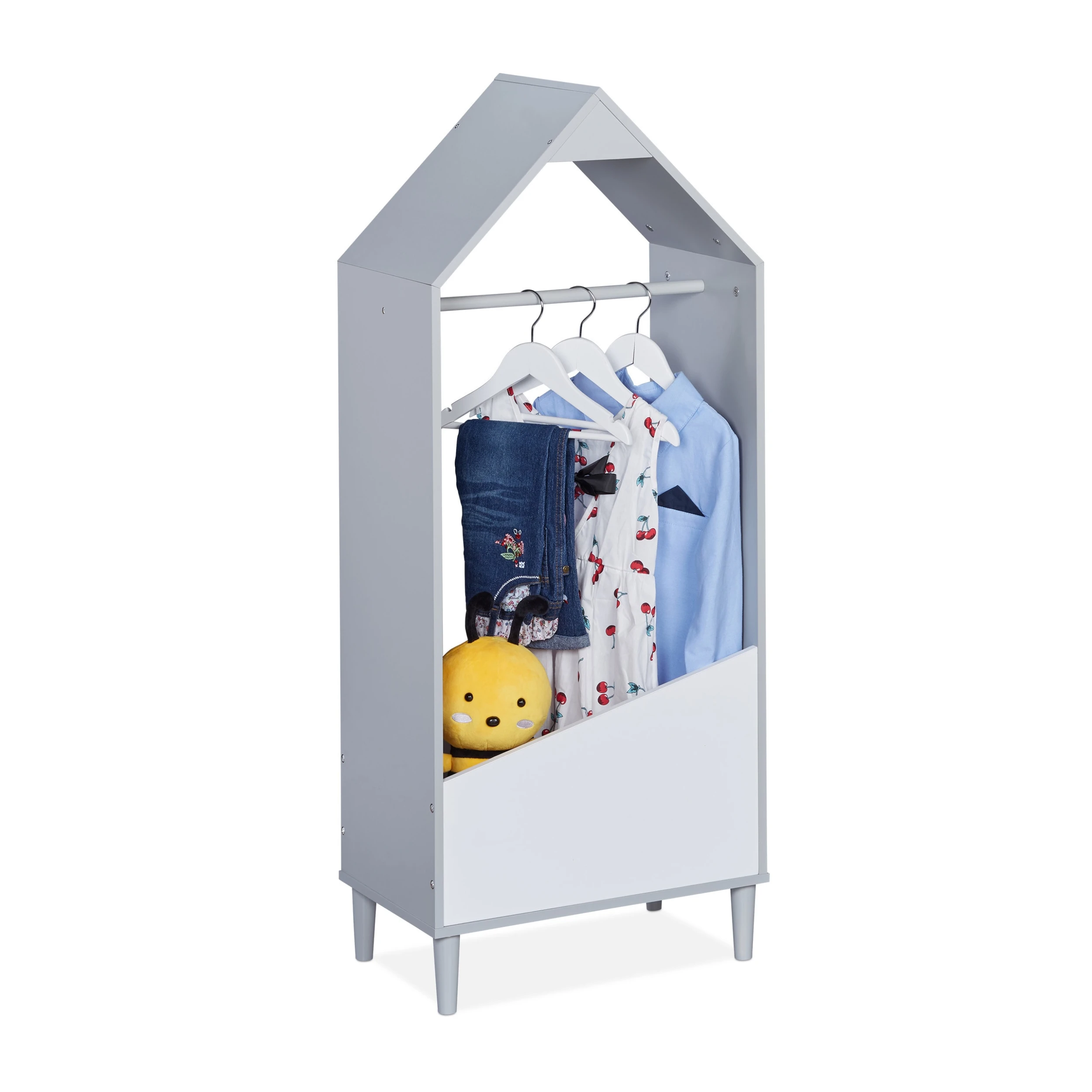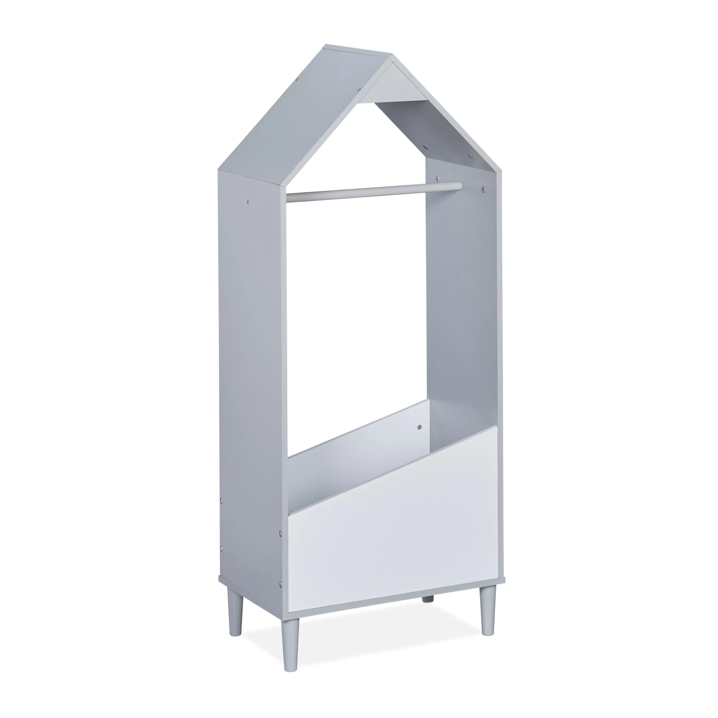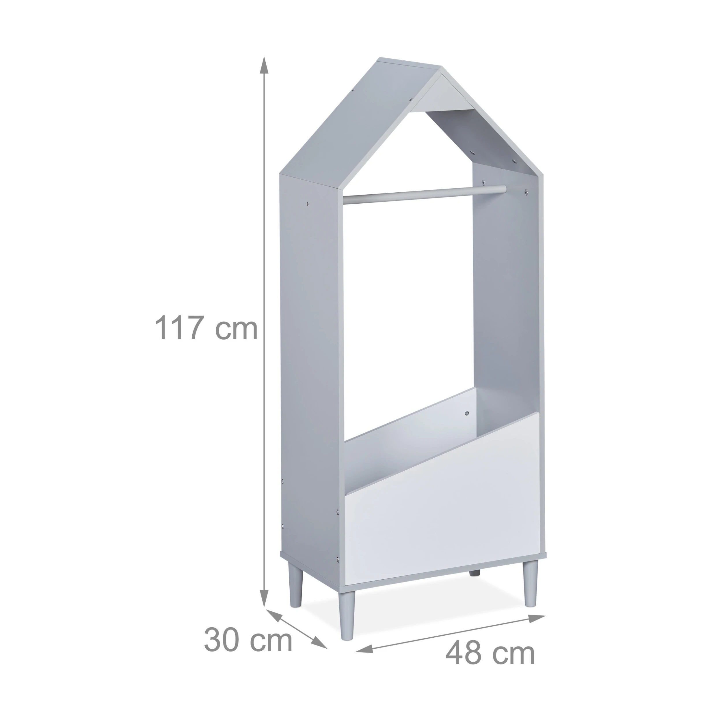 Dieser Kleiderständer in cooler Haus-Form ist das ideale Möbelstück für das Kinderzimmer, um Kinder- und Babykleidung ordentlich aufzubewahren. Shirts, Kleidchen und Jäckchen können an der Garderobenstange aufgehängt werden. Weitere Kleidungsstücke wie Hosen und Mützen, der Rucksack oder auch Spielzeug finden im Ablagefach ihren Platz. Dank der kindgerechten Größe der Standgarderobe können Deine Sprösslinge ihre Kleidung selbstständig aufhängen und so ganz nebenbei lernen, Ordnung zu halten.