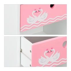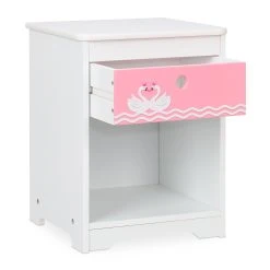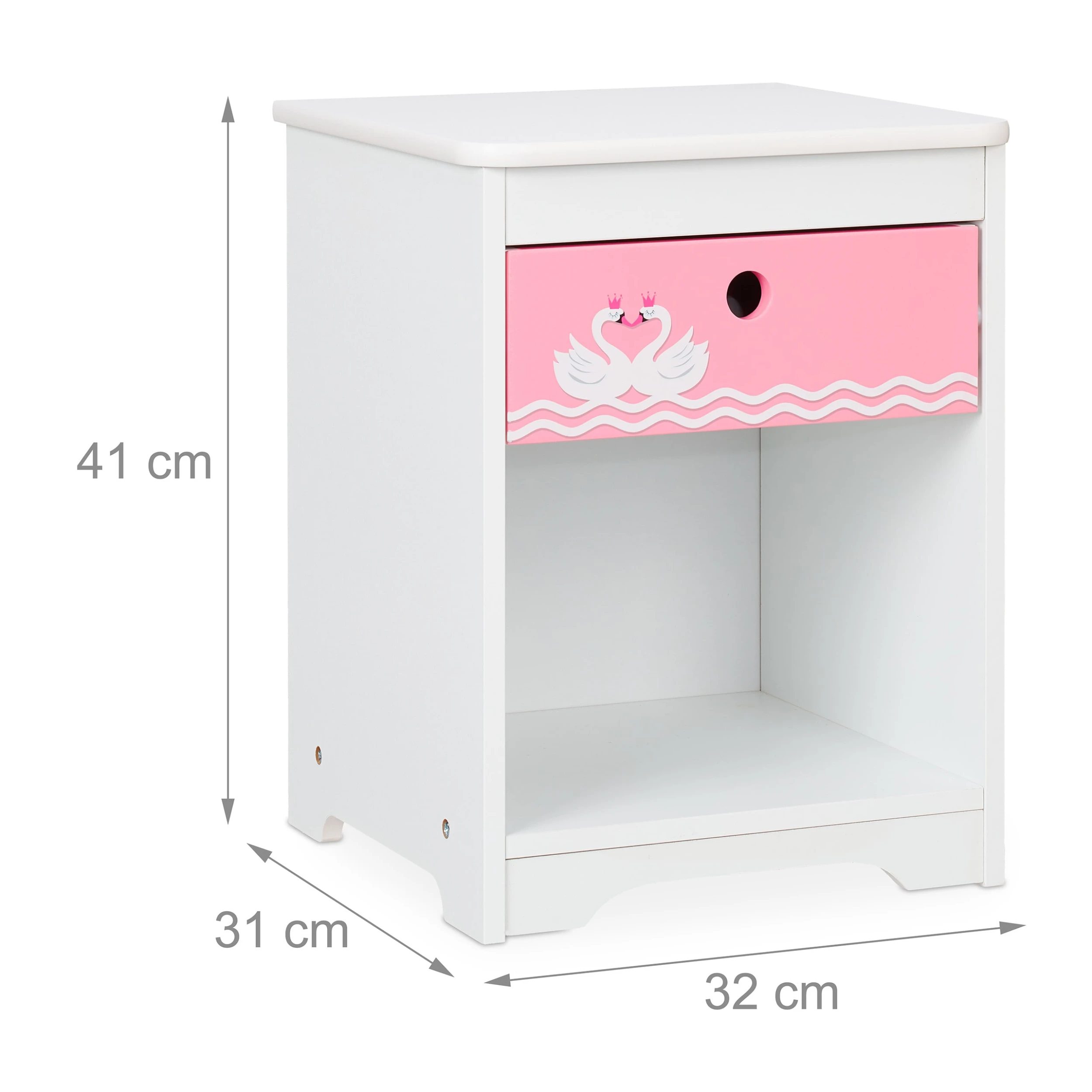 Dieser kleine Nachttischschrank passt perfekt ins Kinderzimmer und sorgt für praktische Ablagefläche neben dem Bett. Auf dem Nachtkästchen finden Bücher und Lampe Platz. Für weiteren Stauraum sorgen die Schublade und das Schrankfach der Kinderzimmerkommode. Durch ihre abgerundeten Ecken und die niedrige Höhe ist die Nachtkommode besonders kindgerecht, sodass Deine Kleinen immer alles griffbereit haben. Das niedliche Schwan-Design in Weiß und Rosa begeistert vor allem Mädchen.