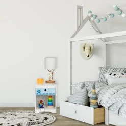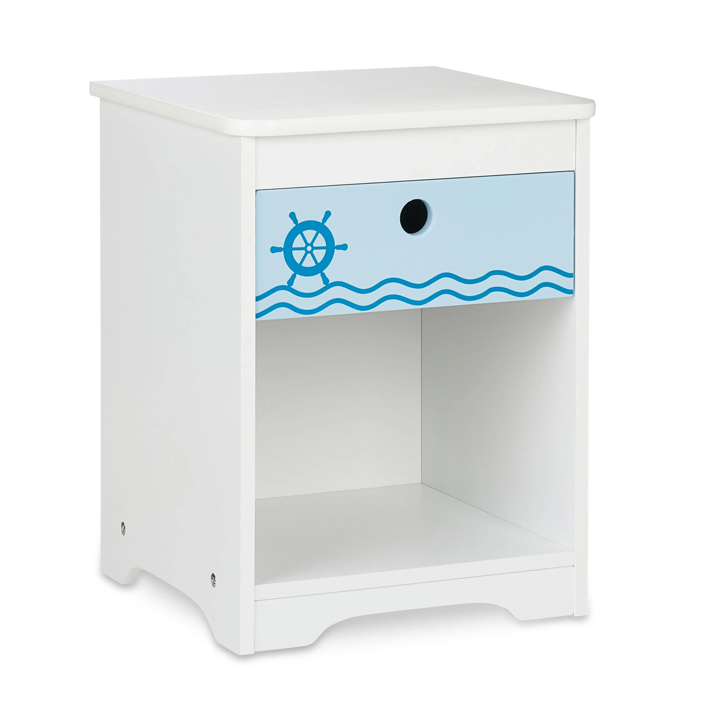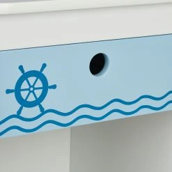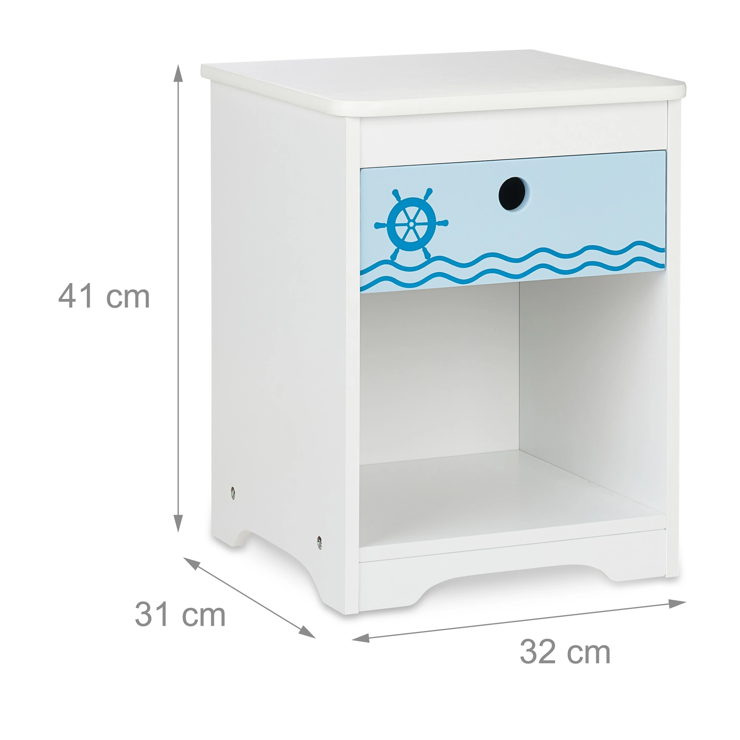 Dieser Kindernachttisch passt perfekt ins Kinderzimmer und lässt sich neben dem Bett bestens als Nachtkästchen nutzen. Auf der Ablage finden Bücher und Lampe Platz. Für weiteren Stauraum sorgen die Schublade und das Schrankfach der Kinderkommode. Durch seine abgerundeten Ecken und die niedrige Höhe ist der Kindernachtschrank besonders kindgerecht, sodass Deine Kleinen immer alles griffbereit haben. Das coole Seemann-Design mit wogenden Wellen und Steuerrad begeistert alle Kinder.