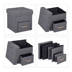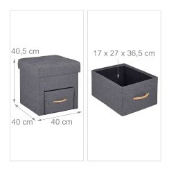 Der Hocker mit Stauraum ist die clevere 2 in 1 Lösung für Wohnzimmer, Flur und andere Wohnbereiche. In der Schublade und im Innenfach verstauen Sie Zeitschriften, Fernbedienung und andere Alltagsgegenstände. Die gepolsterte Sitzfläche sorgt für ein angenehmes Sitzgefühl. Auch als praktischer Fußhocker vor Couch oder Sessel macht der Beistellhocker eine gute Figur. Bei Bedarf lässt sich der Sofahocker platzsparend zusammenfalten und verstauen.