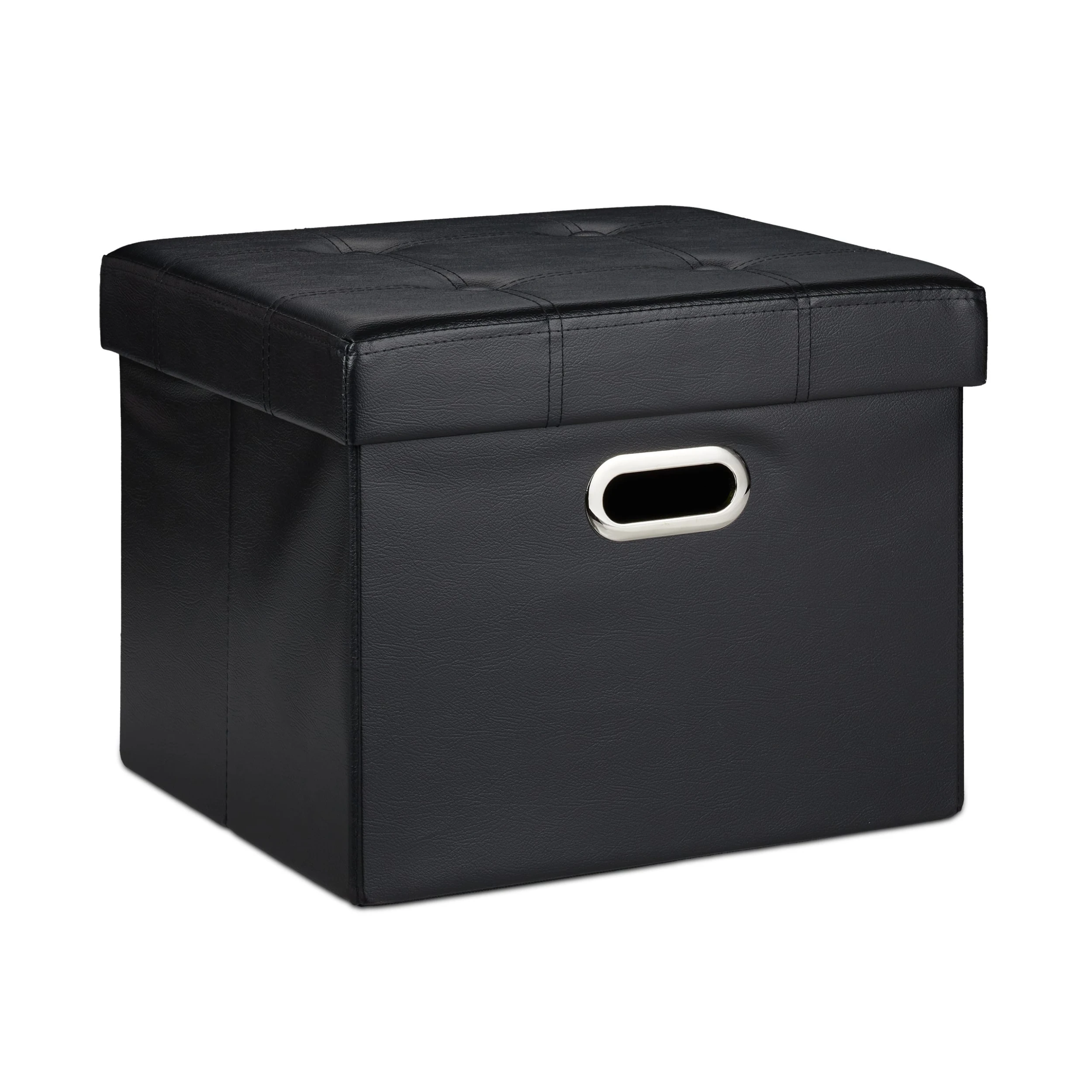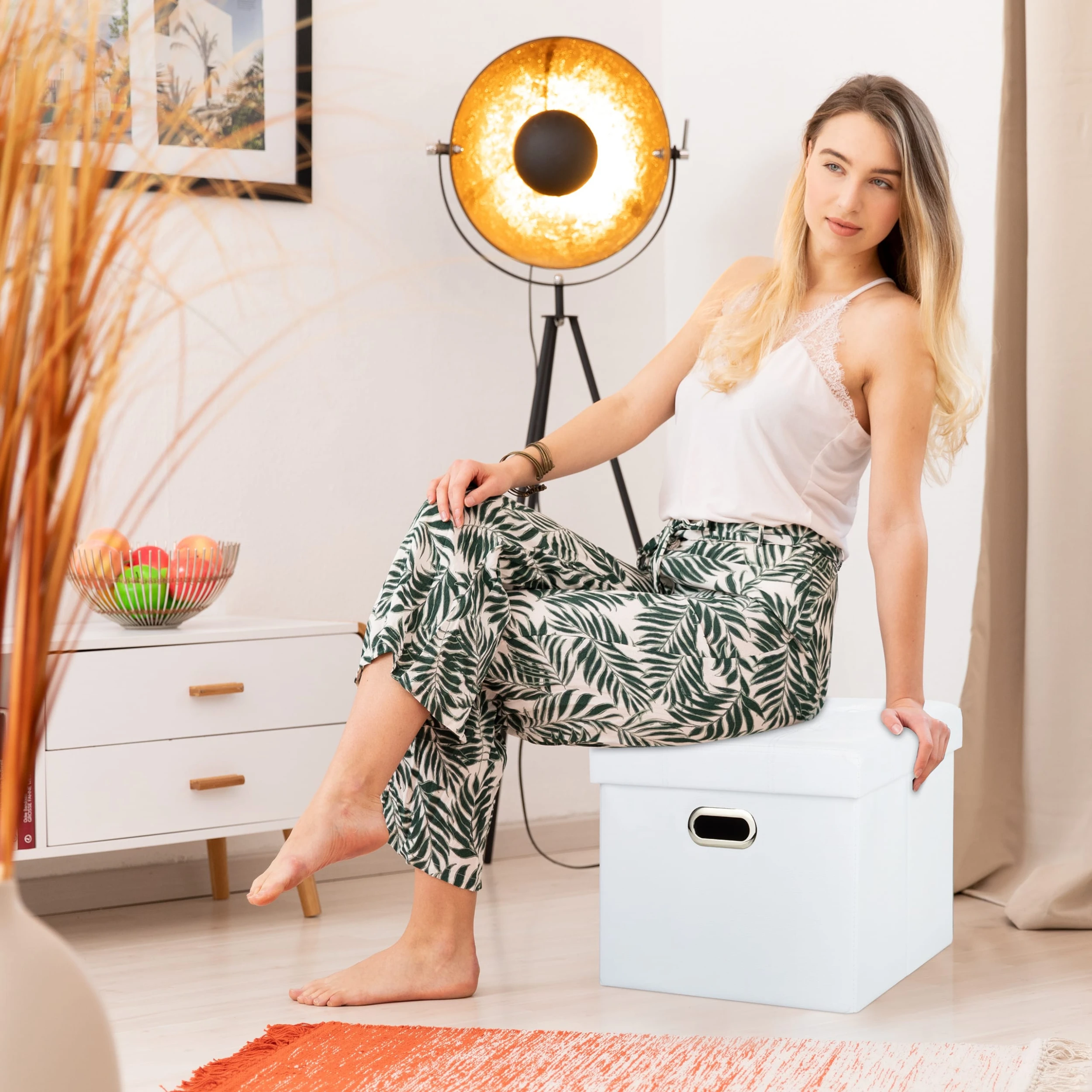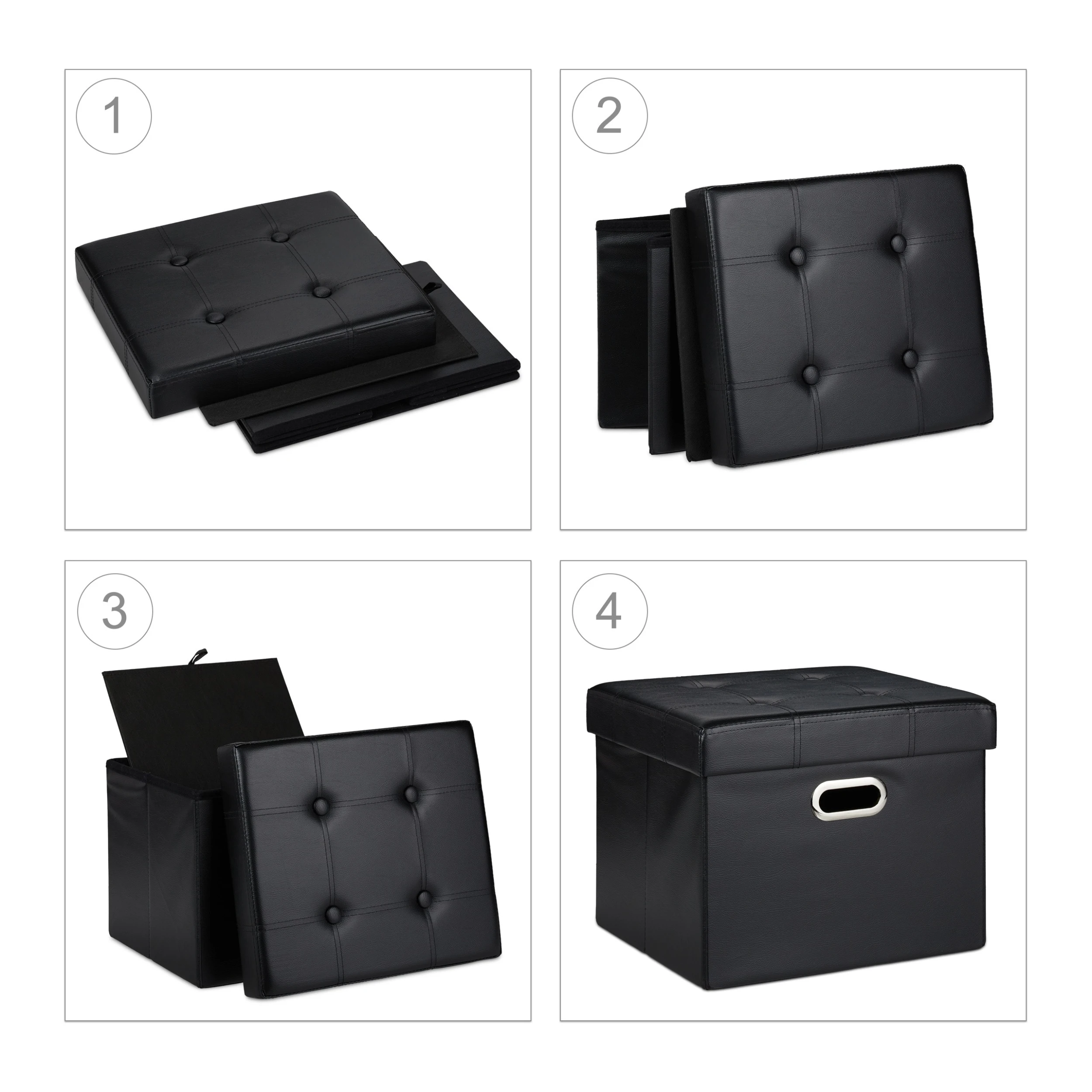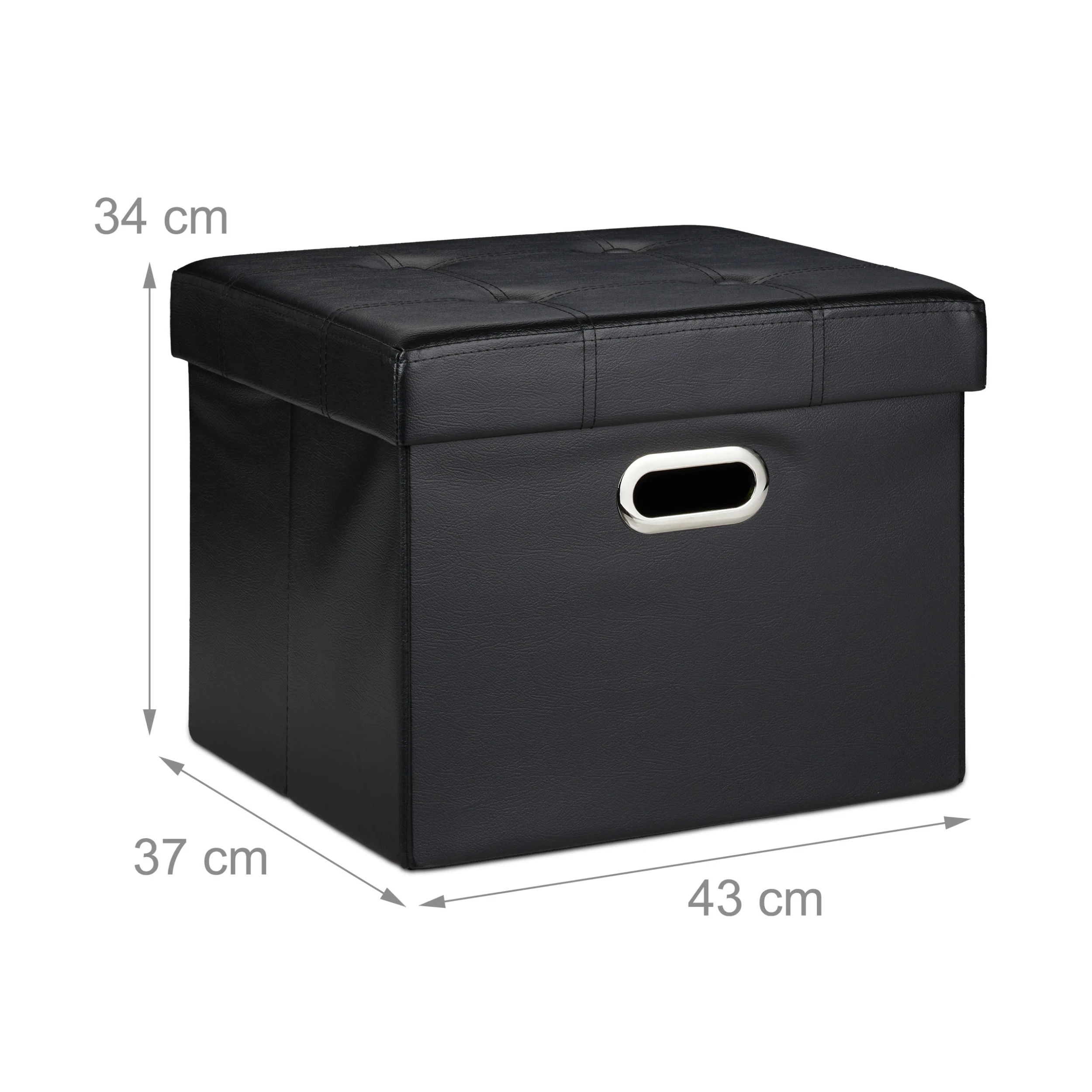 Die Sitzkiste mit Stauraum ist die clevere 2 in 1 Lösung für Wohnzimmer, Schlafzimmer, Flur und andere Wohnbereiche. Die weiche Sitzgelegenheit ist faltbar und somit schnell auf- und abgebaut. Als Aufbewahrungsbox verstauen Sie Decken, Spielsachen, Zeitschriften und andere Alltagsgegenstände schnell und sichtgeschützt. Die gepolsterte Sitzfläche sorgt für ein angenehmes Sitzgefühl. Durch die Lederoptik ist der tragbare Polsterwürfel mit Grifföffnungen ein toller Hingucker.