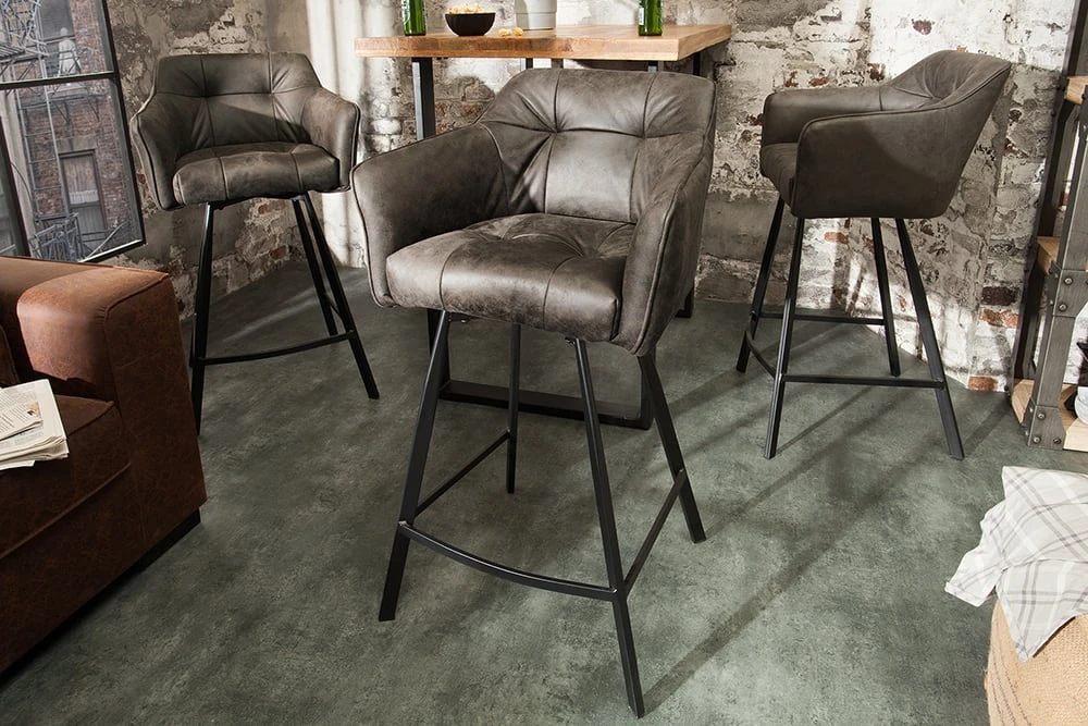 Die zeitlose Farbkombination aus grauem Bezug und schwarzen, pulverbeschichteten Beinen kann wunderbar einfach mit anderen Möbeln und vielen verschiedenen Einrichtungsstilen kombiniert werden. Ob Massivholz-Bartisch oder moderner Tresen in Grau – die Retro-Barhocker werden immer zu einer geschmackvollen Ergänzung Ihrer Hausbar. Übrigens: Damit der Cocktailabend auch nach einigen Stunden immer noch ein echtes Vergnügen bleibt, haben unsere Barstühle natürlich auch eine komfortable Fußablage integriert.