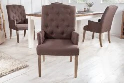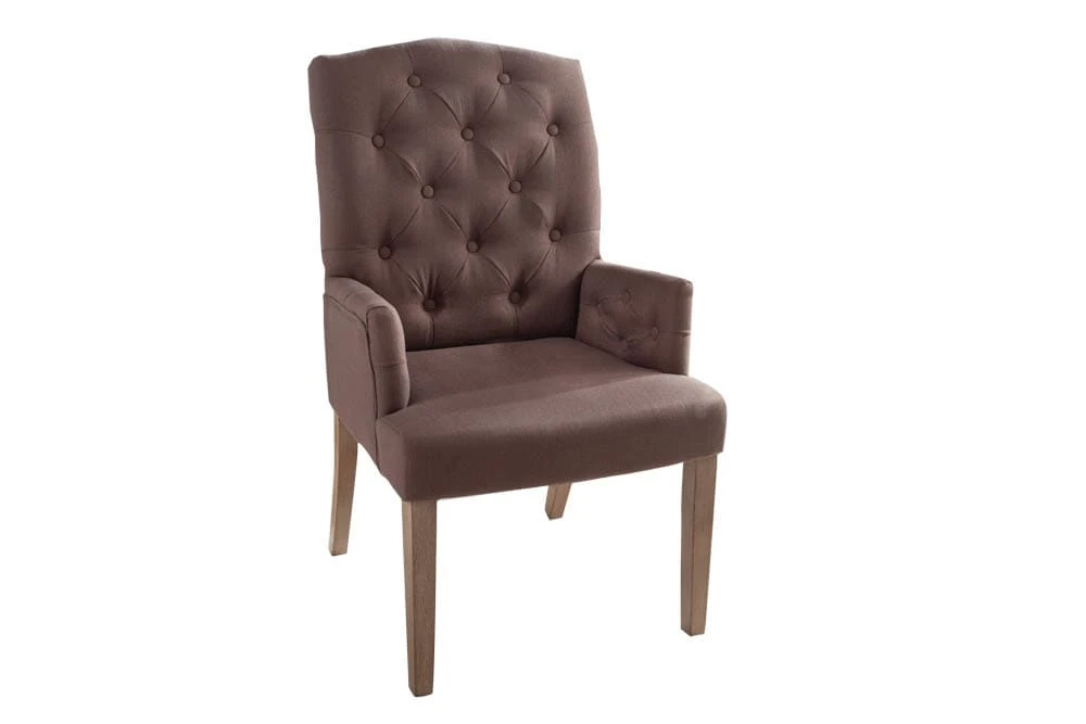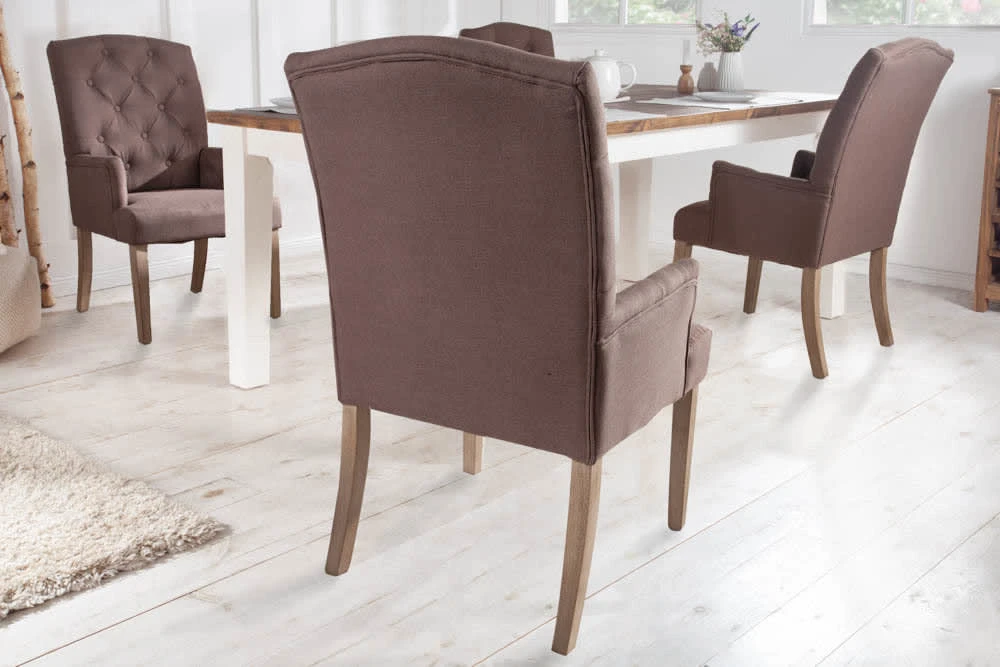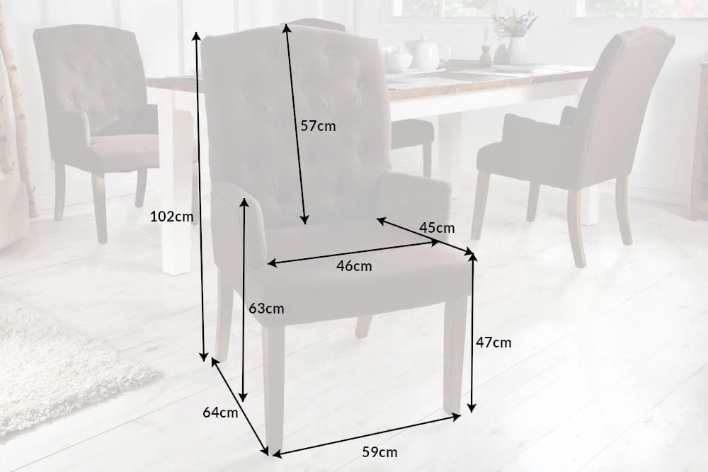 Nimm Platz und freue Dich auf einen neuen Lieblingsplatz am Esstisch! Unsere bequemen Stühle aus der Serie CASTLE vereinen höchsten Sitzkomfort mit einem eleganten, gemütlichen Design. Die hohe Rückenlehne und wahlweise die Armlehnen sorgen für hohen Komfort, zudem ist er mit wunderschönen Zierknöpfen versehen, die an das weltbekannte Chesterfield Design erinnern. Der Bezugsstoff und die Holzfüße hingegen verleihen dem Stuhl seinen charmanten Landhaus-Look.
