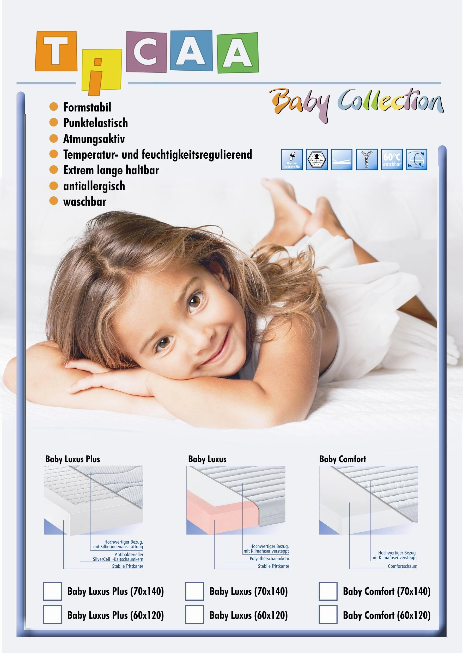 Die Babymatratze “MedAllergen Comfort” aus der Ticaa Baby-Collection Serie zeichnet sich durch eine hohe Punktelastizität und Formstabilität aus. Sie ist atmungsaktiv und dadurch Temperatur- und Feuchtigkeitsregulierend. Der hochwertige Microfaserbezug mit Klimafaser Versteppung ist leicht abnehmbar und bei 60° waschbar. Geeignet für Kinderbetten mit einer Liegefläche von 70x140cm.