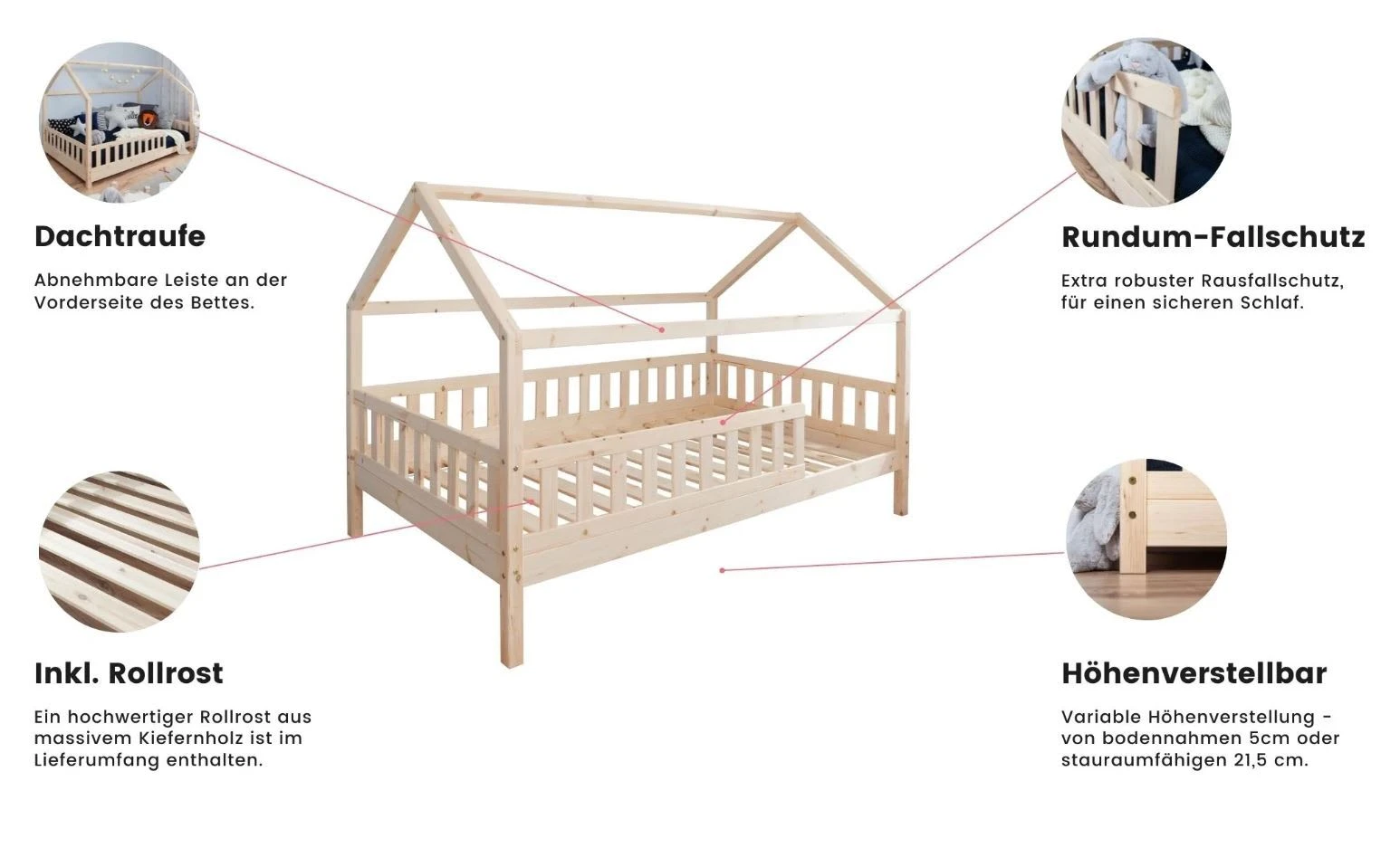 Ein richtiger Kindertraum – Dieses hochwertige, minimalistische Hausbett in edler Optik lädt zum Träumen ein und bietet deinem Schatz einen Ort zum Wohlfühlen und Austoben. Das aus massiver Kiefer gefertigte Bett bietet eine Liegefläche von 100 x 200 cm. Der individuellen Gestaltung deines Hausbettes sind keine Grenzen gesetzt. So wird das Toben richtig schön.
