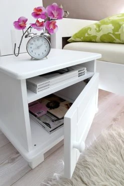 Diese schöne Nachtkommode im Landhaus Stil überzeugt durch wohnliche Optik und einer hochwertigen Verarbeitung dank massiven Kiefernholz. Ein offenes Fach sowie ein Ablagefach hinter der Tür sorgen dafür dass alles seine Ordnung hat. Die Tür kann links oder rechts montiert werden, somit passt sich dieser Nachttisch ideal seinem neuen Stellplatz an.