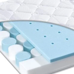 Die Matratze Traumplanet von Träumeland besteht aus einem Kaltschaumkern mit freistehenden “comfort-pads”. Sie haben eine dreidimensionale Form und sorgen somit für eine besonders gute Punktelastizität, wodurch die Wirbelsäule des Babys optimal von Druck entlastet und dennoch gestützt wird. Daneben ist eine ideale Belüftung zwischen den einzelnen pads gewährleistet.