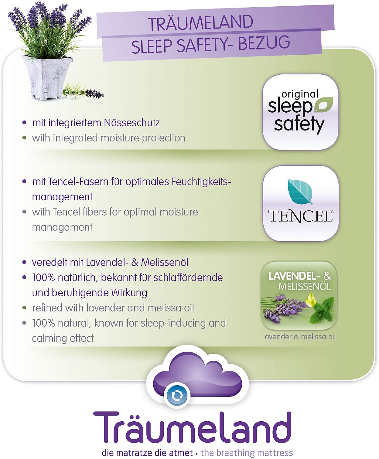 Der Bezug dieser Matratze besteht aus dem “sleep safety Multifunktionsstoff”, der mit dem sogenannten “Wash-Vlies” versteppt ist. Insgesamt bietet dieser Bezug bestmöglichen Schutz gegen Nässe und eine gute Luftdurchlässigkeit zugleich. Gleichzeitig ist er mit natürlichem Lavendel- und Melisseöl veredelt, wodurch eine schlaffördernde und beruhigende Wirkung erzielt wird. Die enthaltenen ®-Fasern werten den Multifunktionsbezug zusätzlich auf. Sie schaffen ein trockenes, gesundes Schlafklima. Zusammen mit dem Vlies ergibt sich eine angenehme, kuschelige Liegefläche. Mittels Reißverschluss können Sie den Bezug zum Waschen abnehmen. Mittels Reißverschluss können Sie den Bezug teilen, sodass eine Seite gewaschen werden kann, während Ihr Kind auf der anderen Seite weiter schläft.