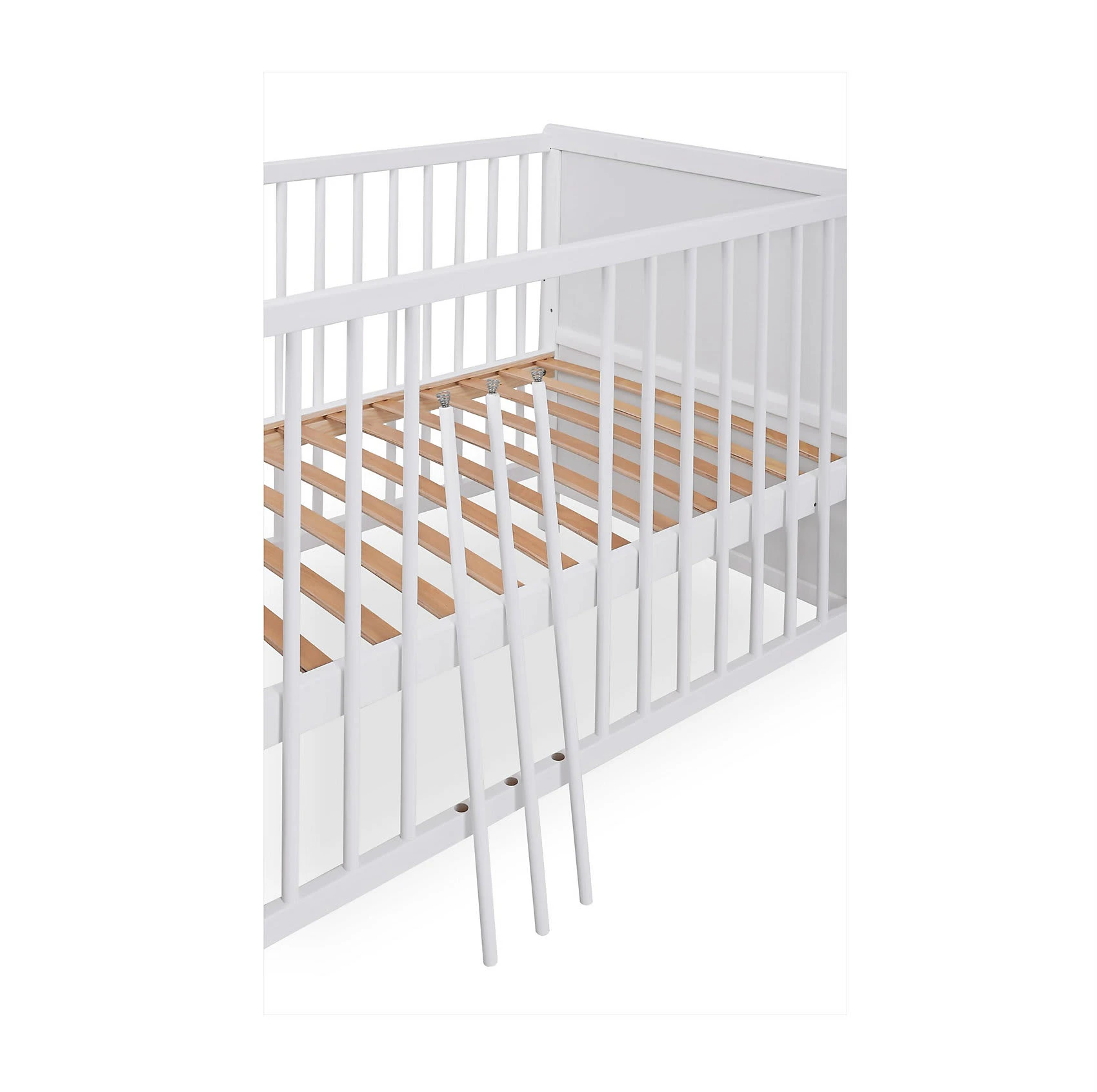 Dieses tolle Kinderbett “Erwin” aus dem Hause Urra passt dank des schlichten und schönen Designs zu fast jedem Einrichtungsstil und bietet dem Baby einen sicheren Schlafplatz. Das Gitterbettchen ist mit einem dreifach höhenverstellbaren Lattenrost ausgestattet, sodass man das Kind besonders rückenschonend hineinlegen und herausholen kann. Wird das Kind älter, kommen die praktischen Schlupfsprossen zum Einsatz. Zu einem späteren Zeitpunkt lässt sich das Bettchen einfach zu einem Kinderbett oder Schlafsofa umbauen. Die dafür benötigten Teile sind bereits im Lieferumfang enthalten. So kann das Kinderbett besonders lange verwendet werden!