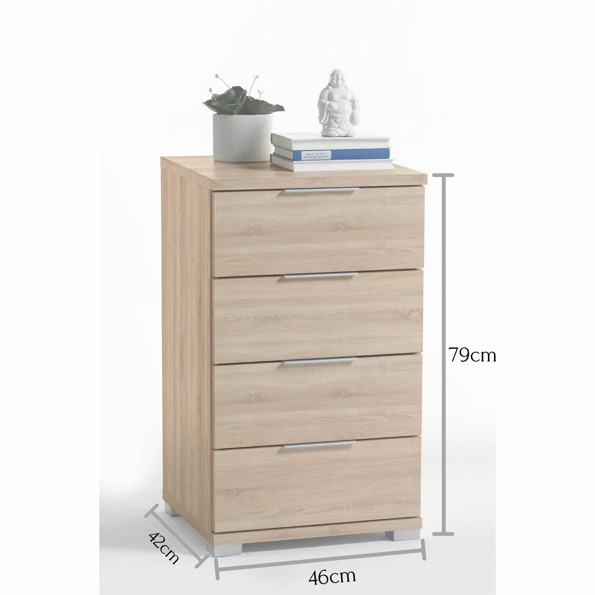 Die Nachtkommode gibt es in 2 Ausführungen, Sonoma Eiche Dekor und Weiß Dekor. Diese Nachtkommode vefügt über 4 Schubladen, die auf Metallschienen geführt werden. Die Nachtkommode kann auch als Kommode verwendet werden. Die Anlieferung per Paketdienst erfolgt in zerlegtem Zustand.