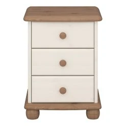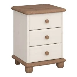 Diese Nachtkommode verfügt über 3 Schubladen, die auf Metallschienen geführt werden. Kiefer massiv weiß lasiert mit Absetzung Stone. Die Nachtkommode wird zerlegt geliefert. Es handelt sich um skandinavische Qualitätsware.