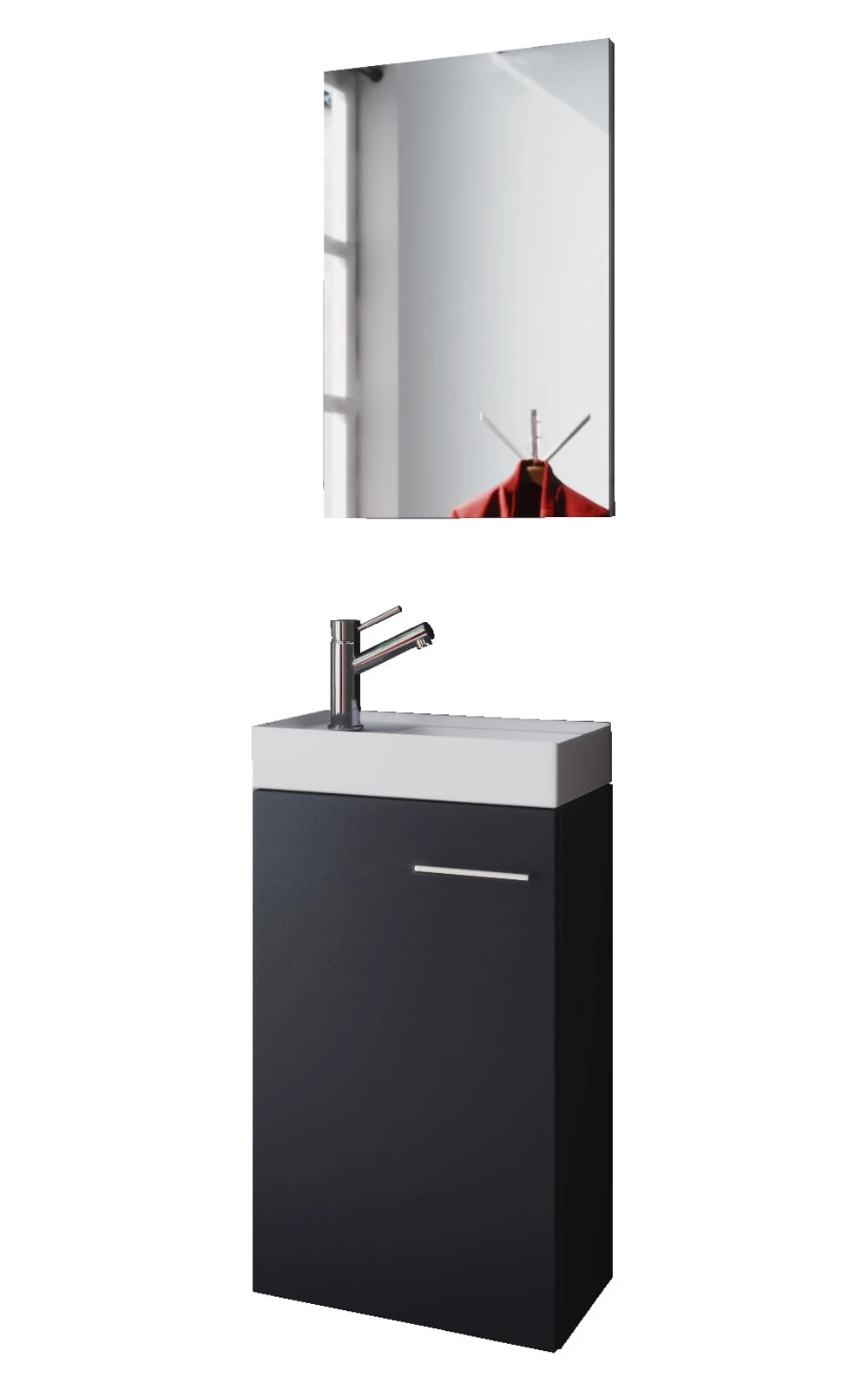 Das Set besteht aus einem Spiegel und einem Waschbecken mit Waschbeckenunterschrank. Eine sehr elegante Einrichtungslösung für WCs oder Gästetoiletten, um ein optisches Highlight zu setzen.