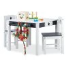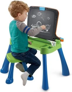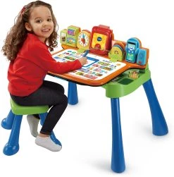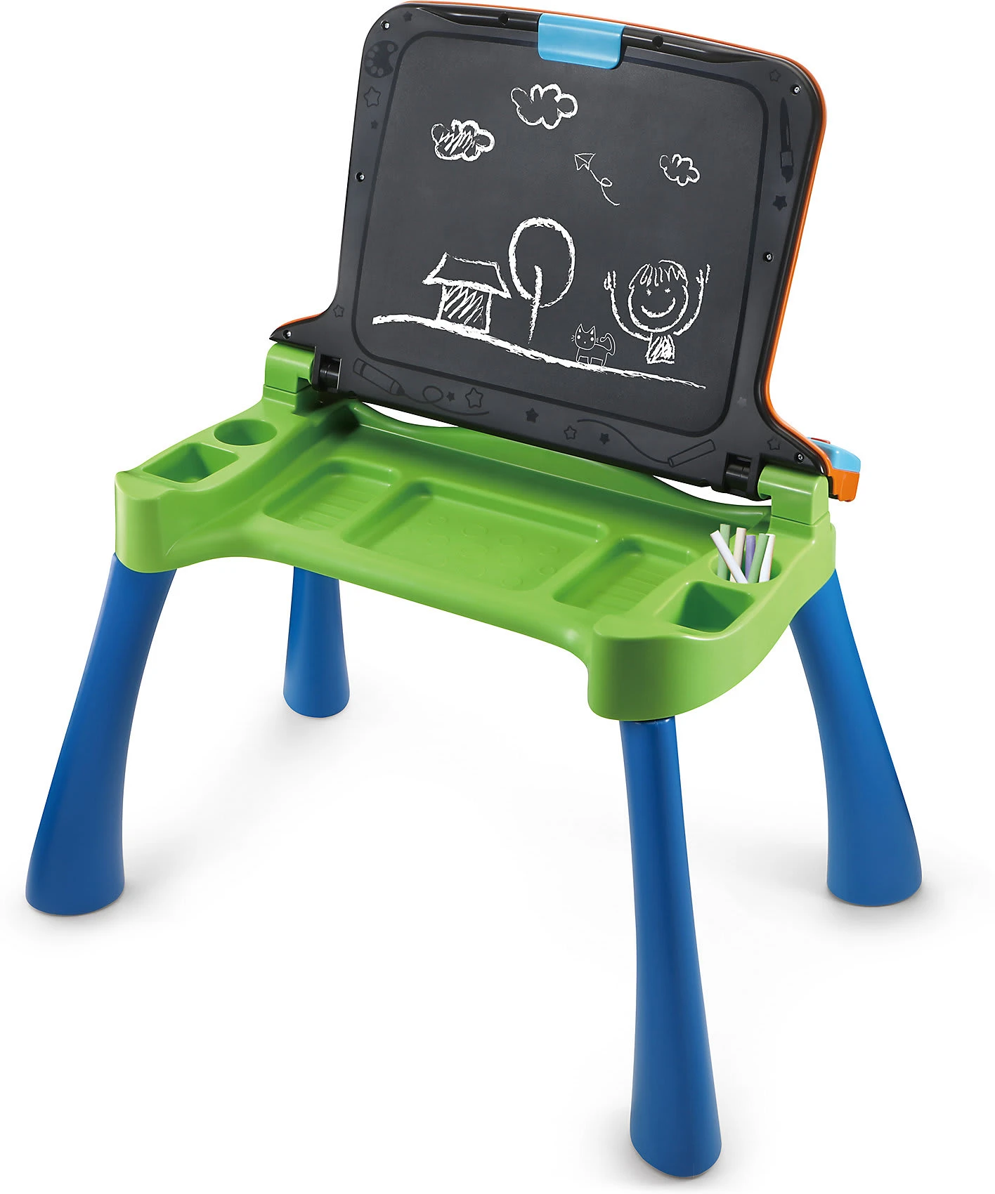 Der magische Spiel- und Schreibtisch von vtech bietet fünffachen Spiel- und Lernspaß für Kinder ab drei Jahren. Magischer Spiel- und Schreibtisch 5-in-1 von vtech verwandelt sich in eine Kreidetafel Schreibfläche mit LED-Bildschirm, integriertem Tipp-Stift, interaktiver Touch-Oberfläche herausklappbarer Projektor mit 4 Scheiben (28 Motive), Spieluhr mit verstellbaren Zeigern, Rolle mit Wochentagen, Wetter-Schieber, Bilderrahmen, Musik-Station (über 30 Melodien) 2 Aktivitätsseiten (Themen: Zahlen & Zählen, Musikinstrumente, Der menschliche Körper & Kleidung, Formen & Farben) inkl. Hocker (belastbar bis 34 kg) kindersicheres Batteriefach, Lautstärkeregler, Abschaltautomatik benötigte Batterien, 4xAA nicht im Lieferumfang enthalten ab 3 Jahren geeignet deutschsprachig Der interaktive Schreibtisch überzeugt mit spannenden Funktionen: Die Schreibfläche ist mit einem LED-Bildschirm, dessen Oberfläche auf Berührung reagiert, und einem Tipp-Stift ausgestattet. Mit dem interaktiven Stift können die Buchstaben des Alphabets auf dem Bildschirm nachgefahren werden – so macht das Schreiben lernen gleich doppelt Spaß. Zwei beidseitig bedruckte Aktivitätenseiten können ebenfalls auf die interaktive Tischoberfläche gelegt werden und bringen den Kleinen so spielerisch vier Themengebiete näher: Zahlen und Zählen, Musikinstrumente, Der menschliche Körper und Kleidung sowie Formen und Farben. Der herausklappbare Projektor projiziert spannende Animationen auf die Maloberfläche: mit den mitgelieferten vier Scheiben können insgesamt 28 Motive dargestellt werden. Zwei der Scheiben beschäftigen sich mit dem Zeichnen lernen – einfach ein Blatt Papier unterlegen und schon können die Motive mit Buntstiften nachgefahren werden. Die anderen beiden Schreiben projizieren bunte Motive auf die Aktivitätenseiten, die dann in das Projektor-Spiel integriert werden können. Zudem verfügt der Tisch über eine Spieluhr mit verstellbaren Zeigern, eine Rolle mit einstellbaren Wochentagen, einem Schieber zum Anzeigen des aktuellen Wetters und Bilderrahmen für Fotos von Familie und Freunden. Die inkludierte Musikstation spielt außerdem über 30 Melodien ab.