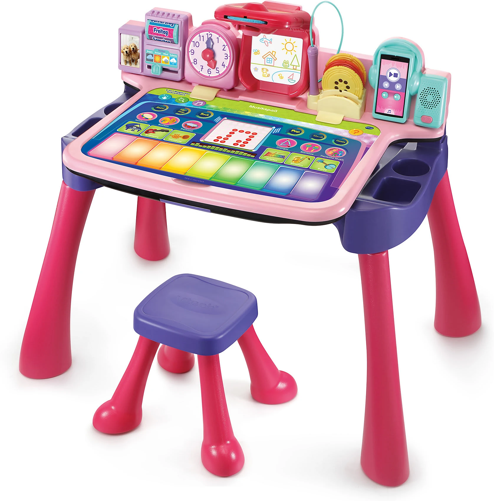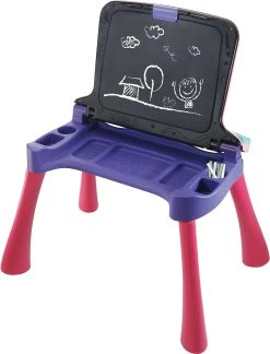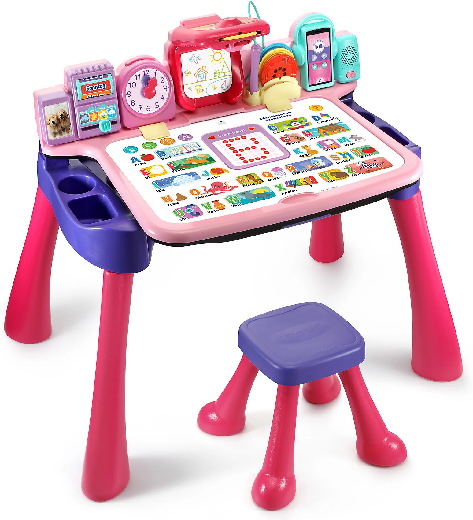 Der magische Schreibtisch aus dem Hause Vtech bietet Kindern viele tolle Beschäftigungen und großen Lernspaß! Auf dem passenden Hocker kann man es sich bequem machen und fröhlich anfangen das Schreiben, Rechnen und vieles mehr zu lernen. Mit dem herausklappbaren Projektor lassen sich insgesamt 28 Motive auf den Tisch projizieren, die mit bunten Farben nach- und ausgemalt werden können. Auf dem LED Bilschirm lassen sich Buchstaben nachfahren, sodass Kinder spielerisch das Schreiben lernen. Auch eine Spieluhr, Anzeigen für Wochentage und das Wetter, ein Bilderrahmen und eine Musikstation mit mehr als dreißig Melodien sind in den Tisch integriert.