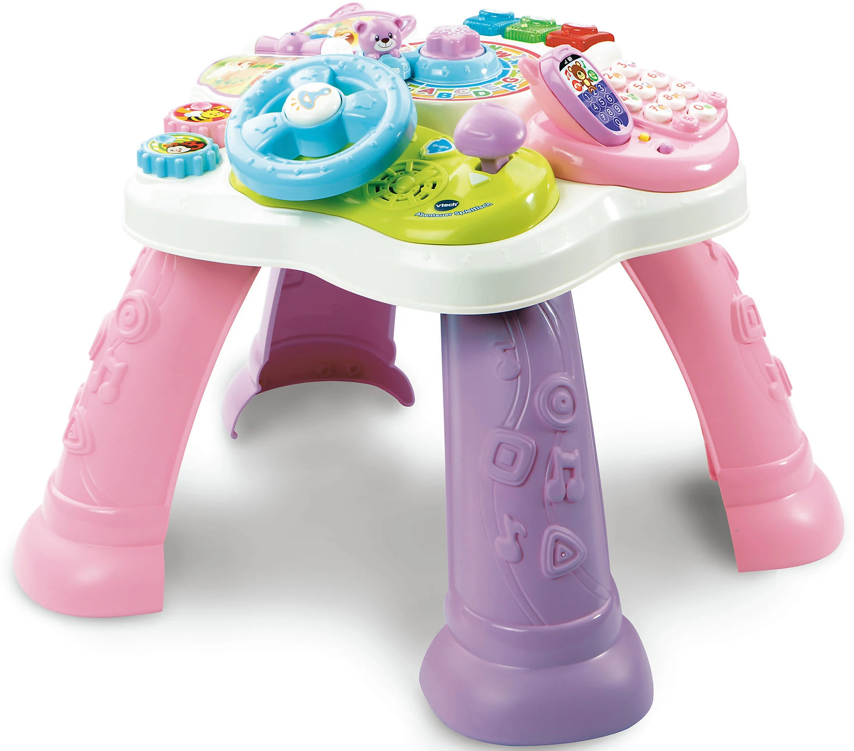 Kunterbunter Entdeckerspaß! Am Entdeckertisch von Vtech gibt es viele verschiedene Spielmöglichkeiten und jedes Mal etwas Neues zu entdecken! Die vielen verschiedenen Ton- und Leuchteffekte, sowie ein Telefon mit Tasten, ein Lenkrad und vieles mehr bieten viel Abwechslung und spanenden Spiel-Spaß. Damit kann man sich endlos beschäftigen!