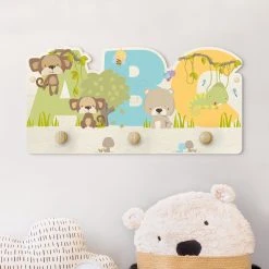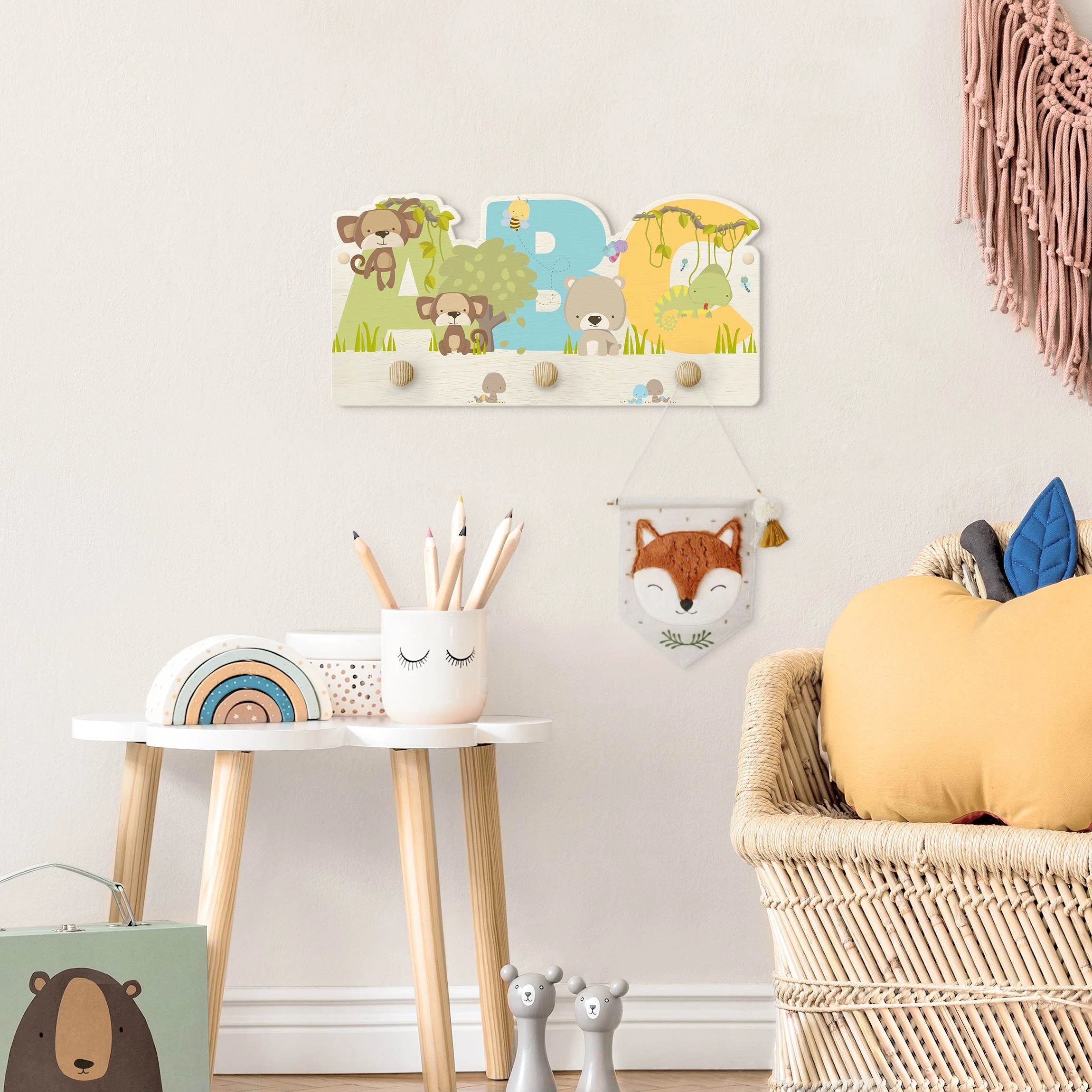 WallArt Kindergarderobe Holz – ABC – Affe Bär Chamäleon In Bunt