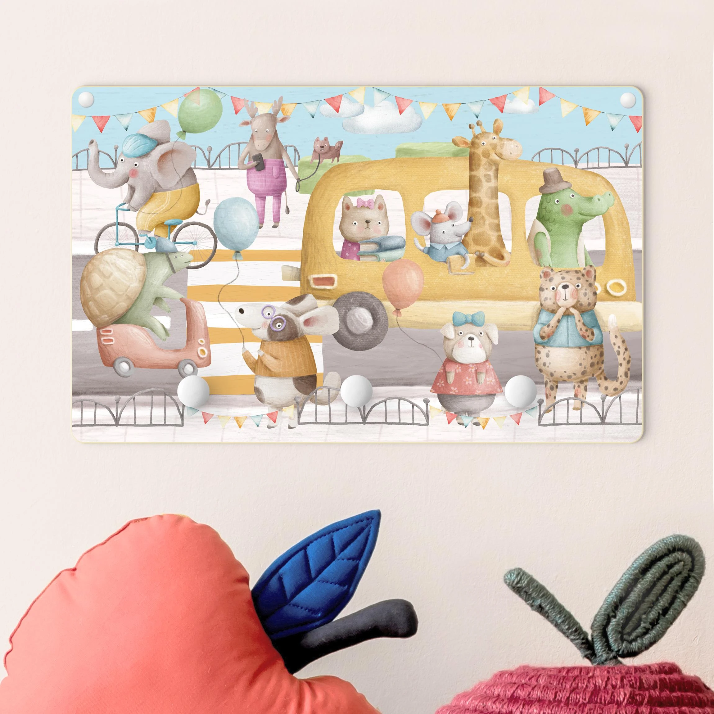 WallArt Kindergarderobe Holz – Aquarell Tierfest In Pfotenhausen In Bunt