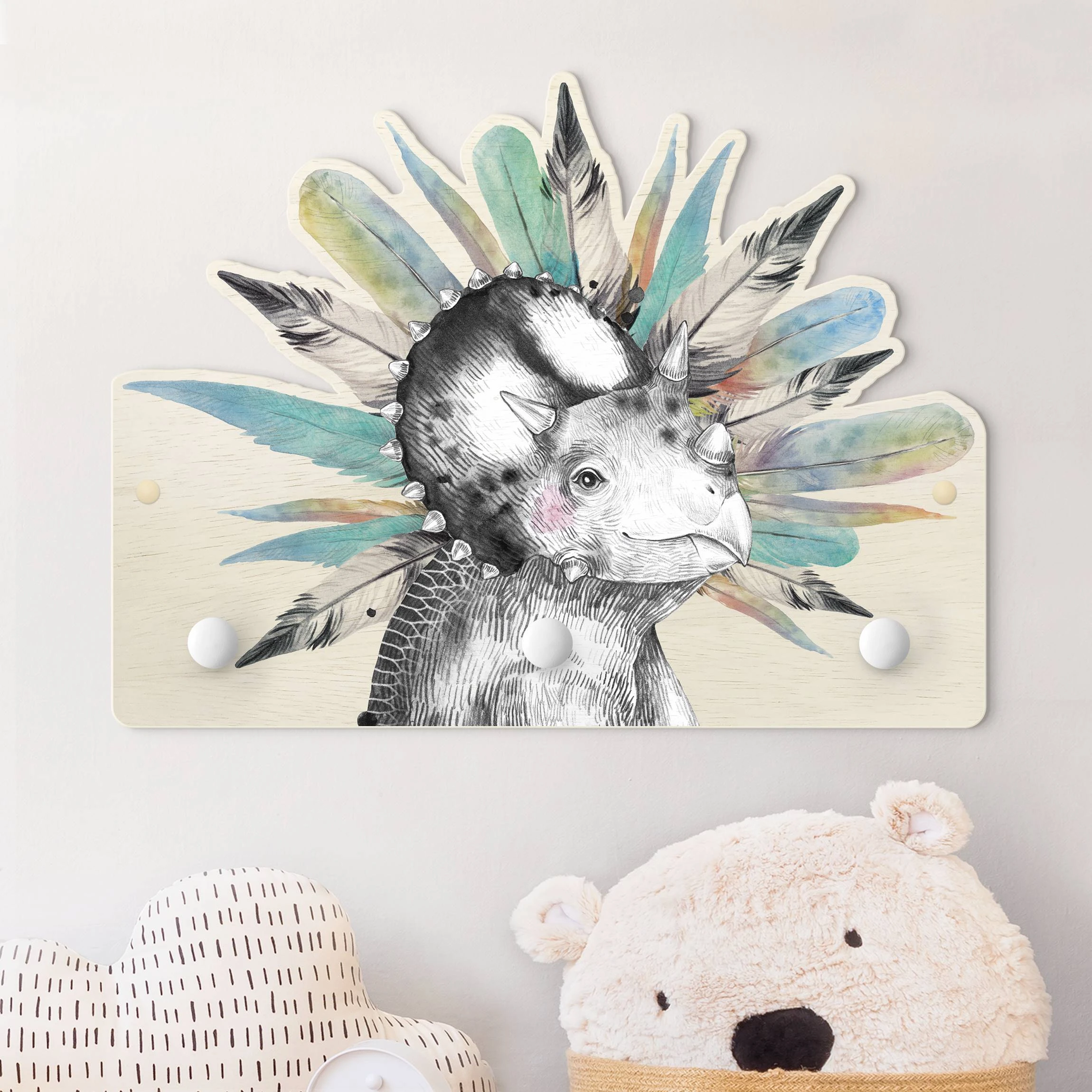 WallArt Kindergarderobe Holz – Baby Triceratops Mit Federkrone In Blau