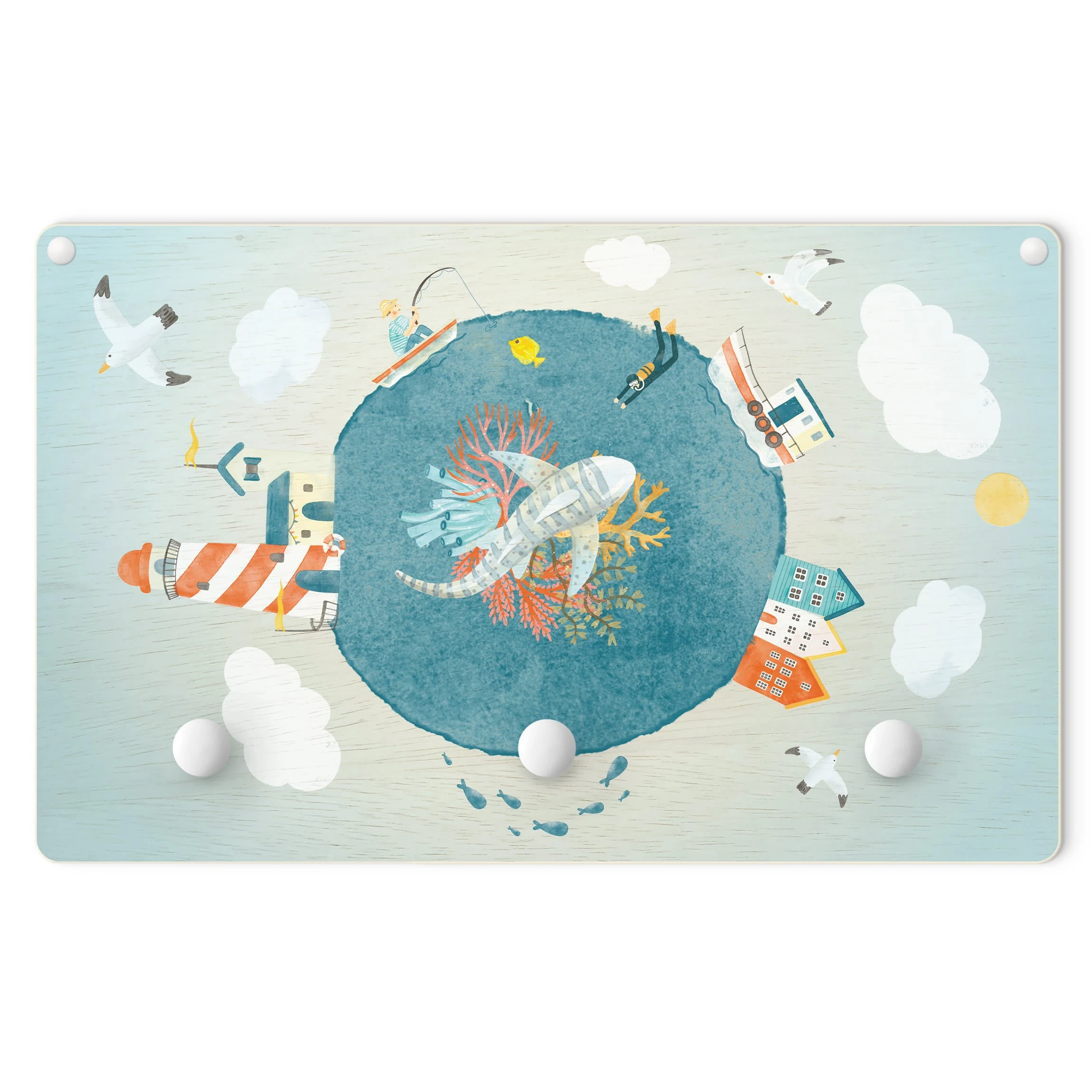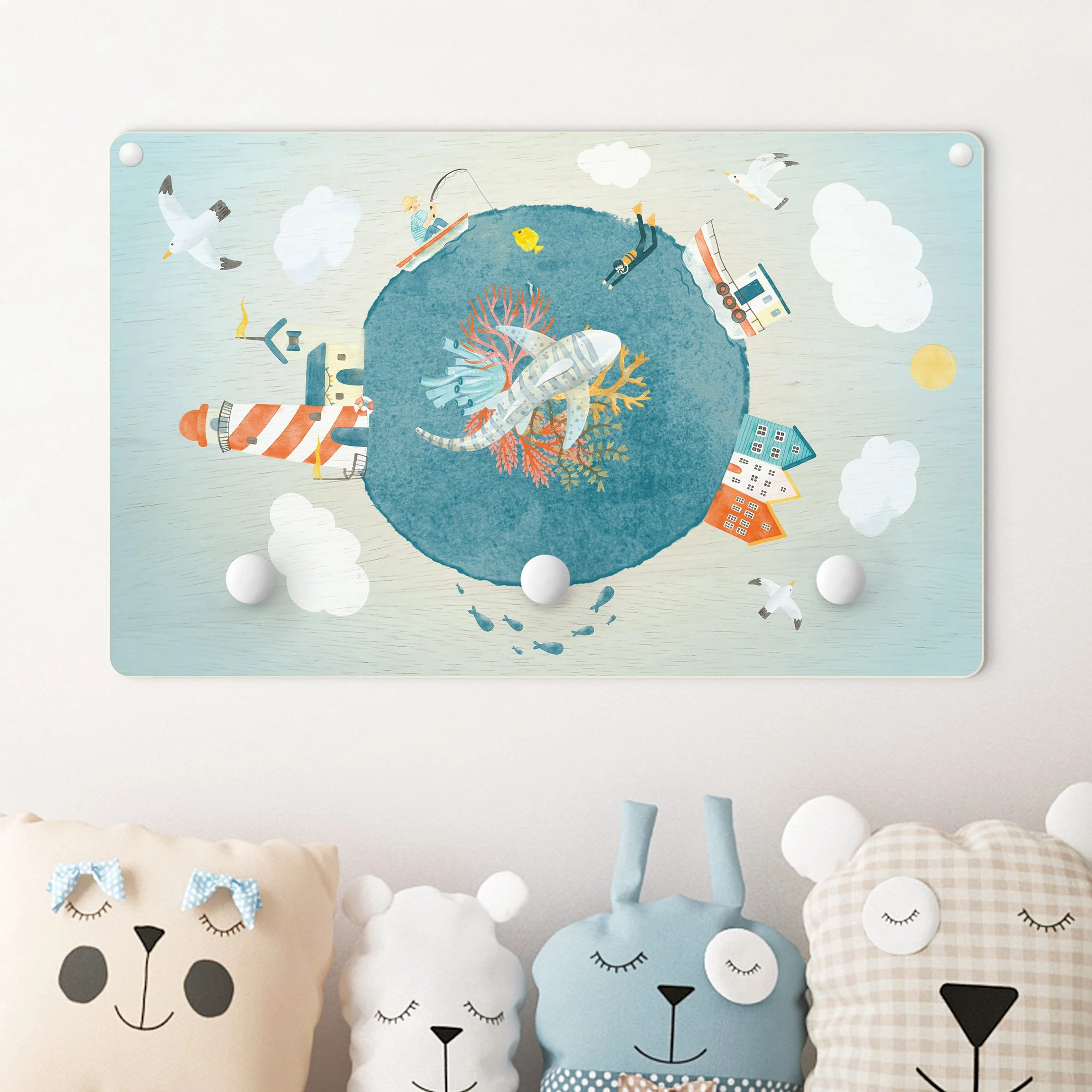 WallArt Kindergarderobe Holz – Buntes Treiben Auf Dem Meer In Blau