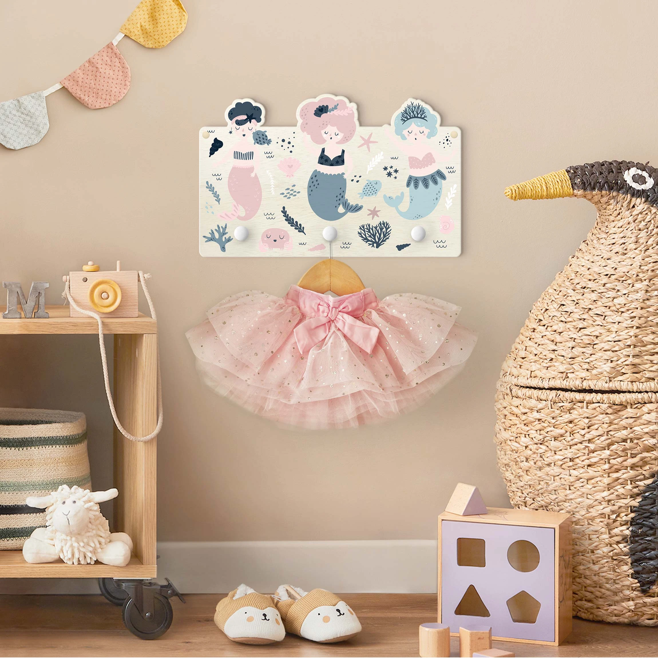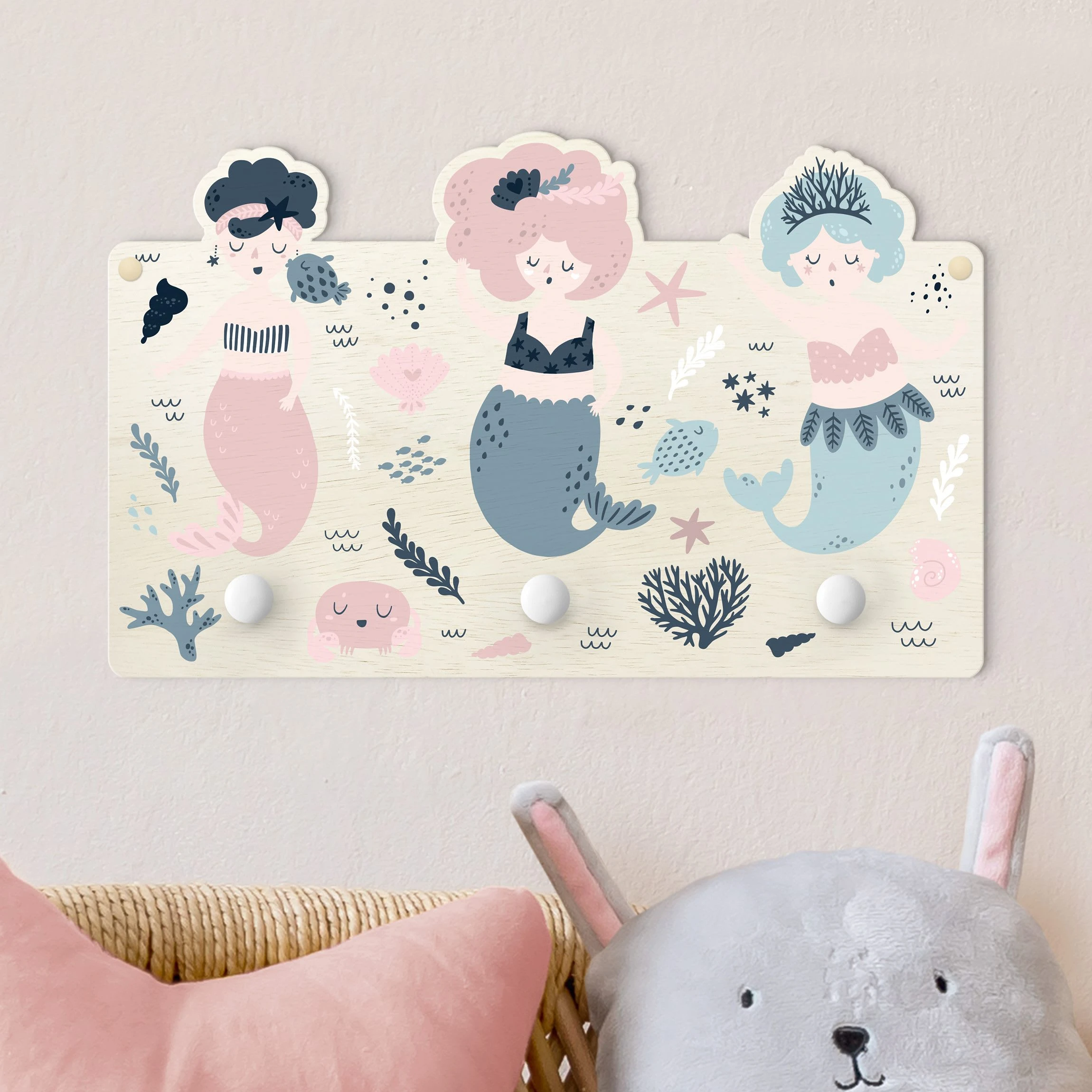 WallArt Kindergarderobe Holz – Drei Fabelhafte Meerjungfrauen In Pastell