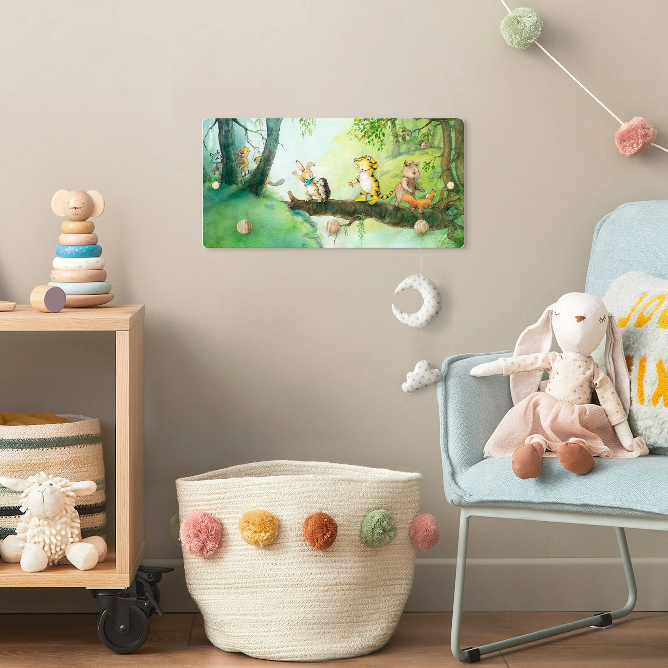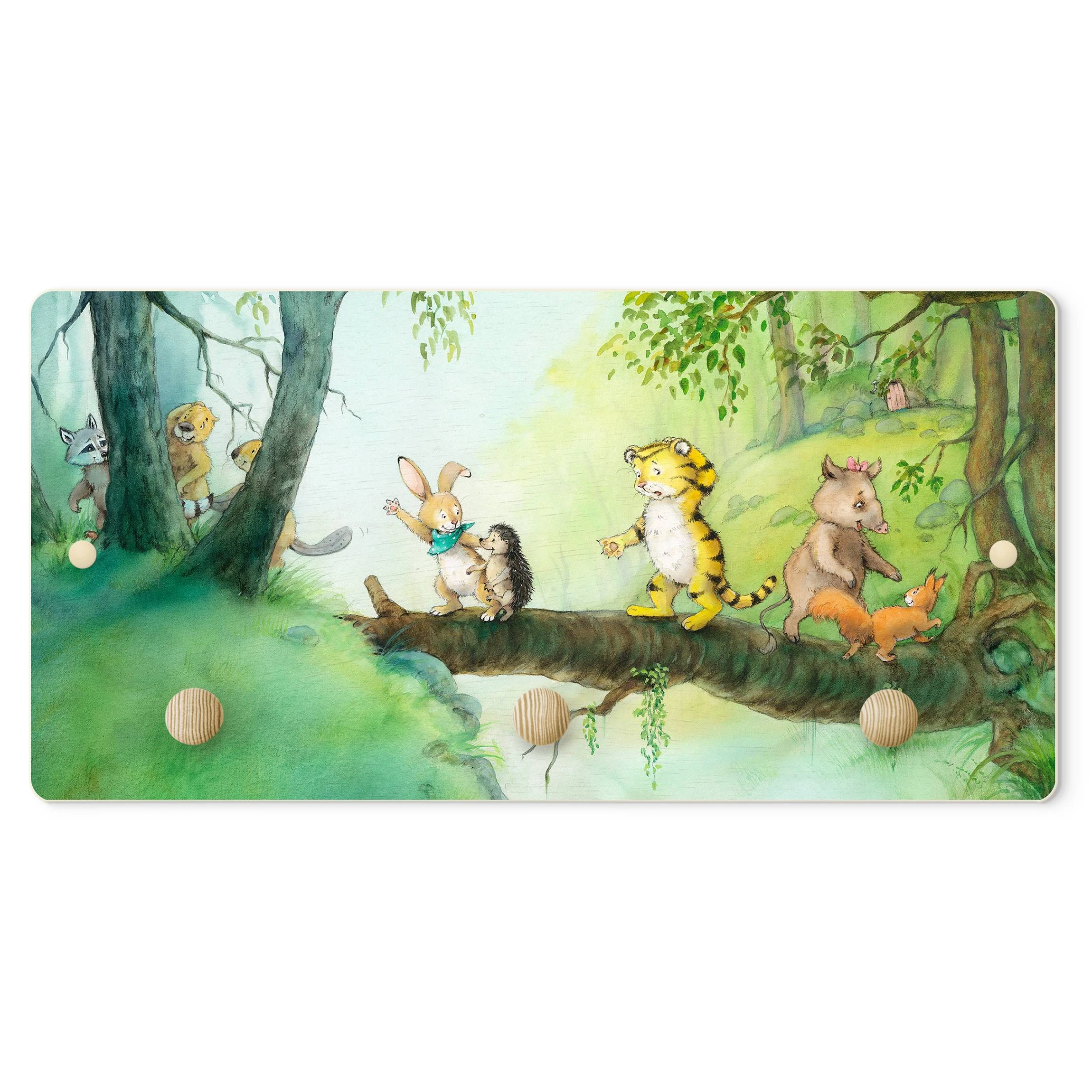 WallArt Kindergarderobe Holz – Kleiner Tiger – Baumbrücke In Grün