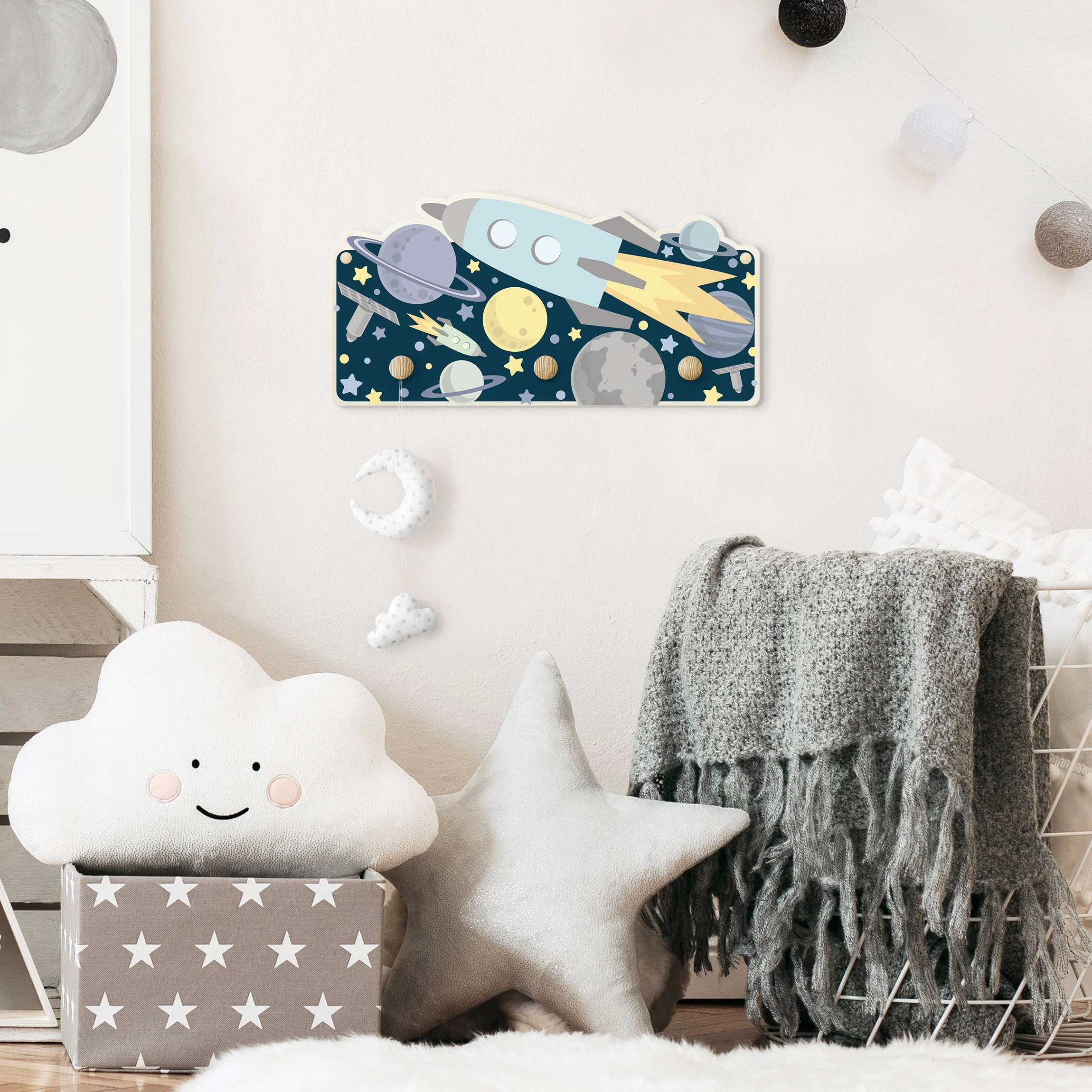 WallArt Kindergarderobe Holz – Rakete Und Planeten In Blau