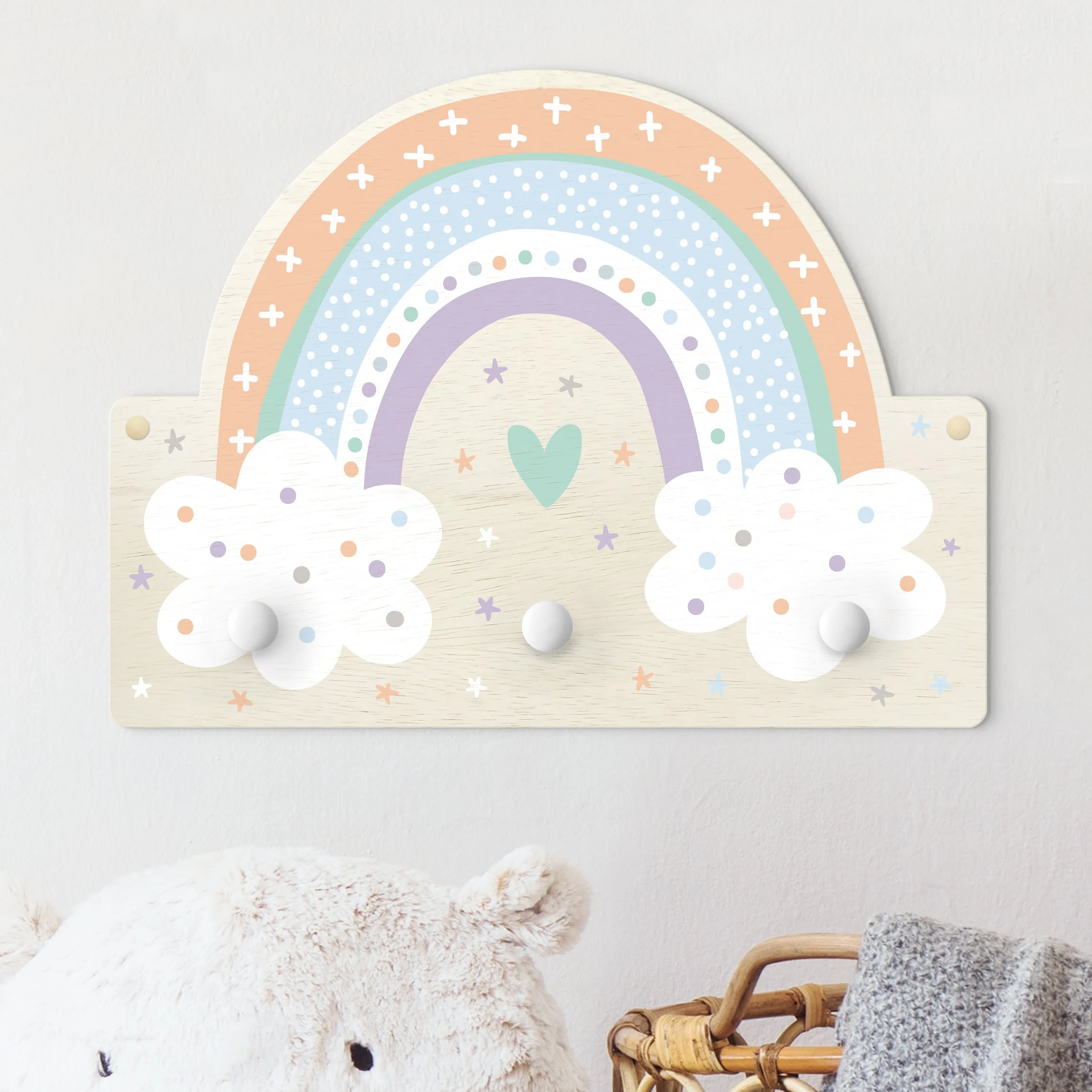 WallArt Kindergarderobe Holz – Regenbogen Mit Wolken Pastell In Pastell