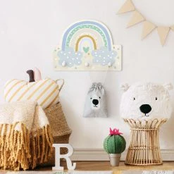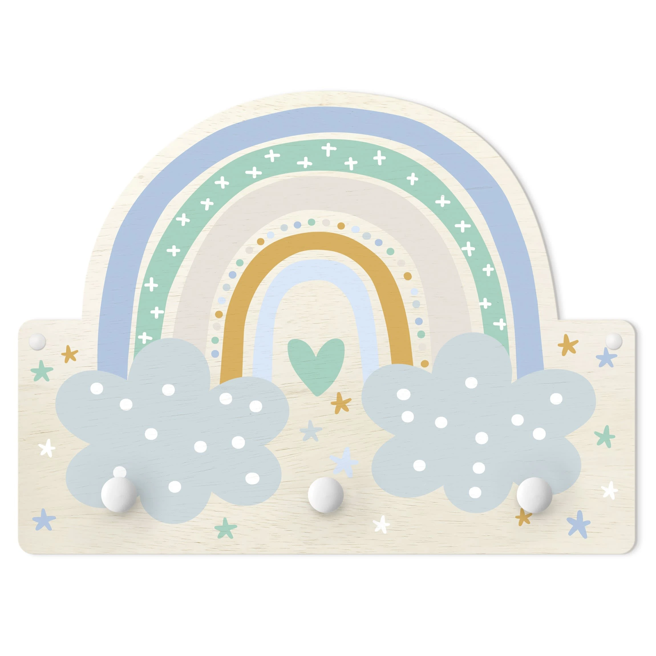 WallArt Kindergarderobe Holz – Regenbogen Mit Wolken Türkis In Pastell