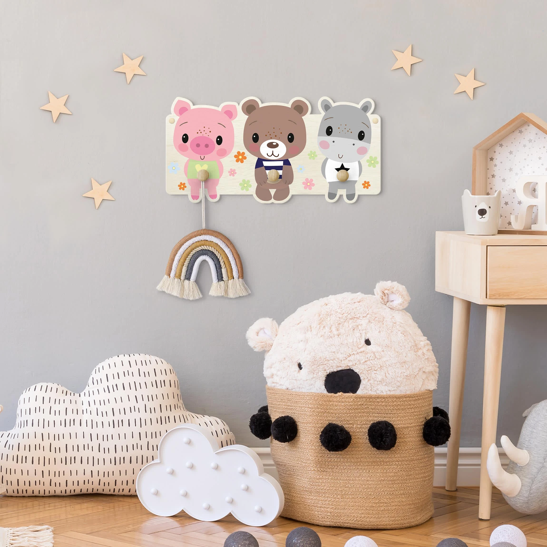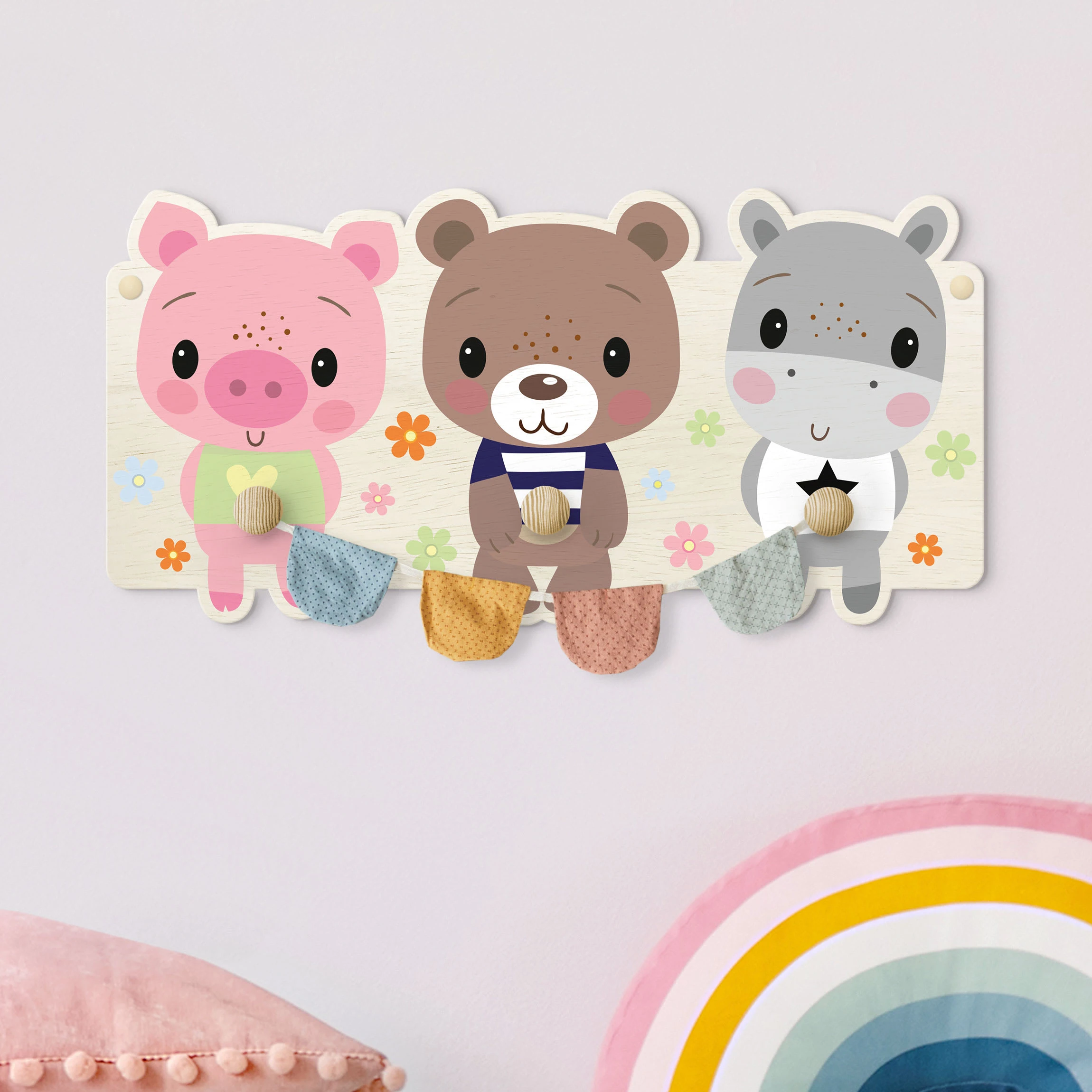 WallArt Kindergarderobe Holz – Schwein BĂ€r Nilpferd In Bunt