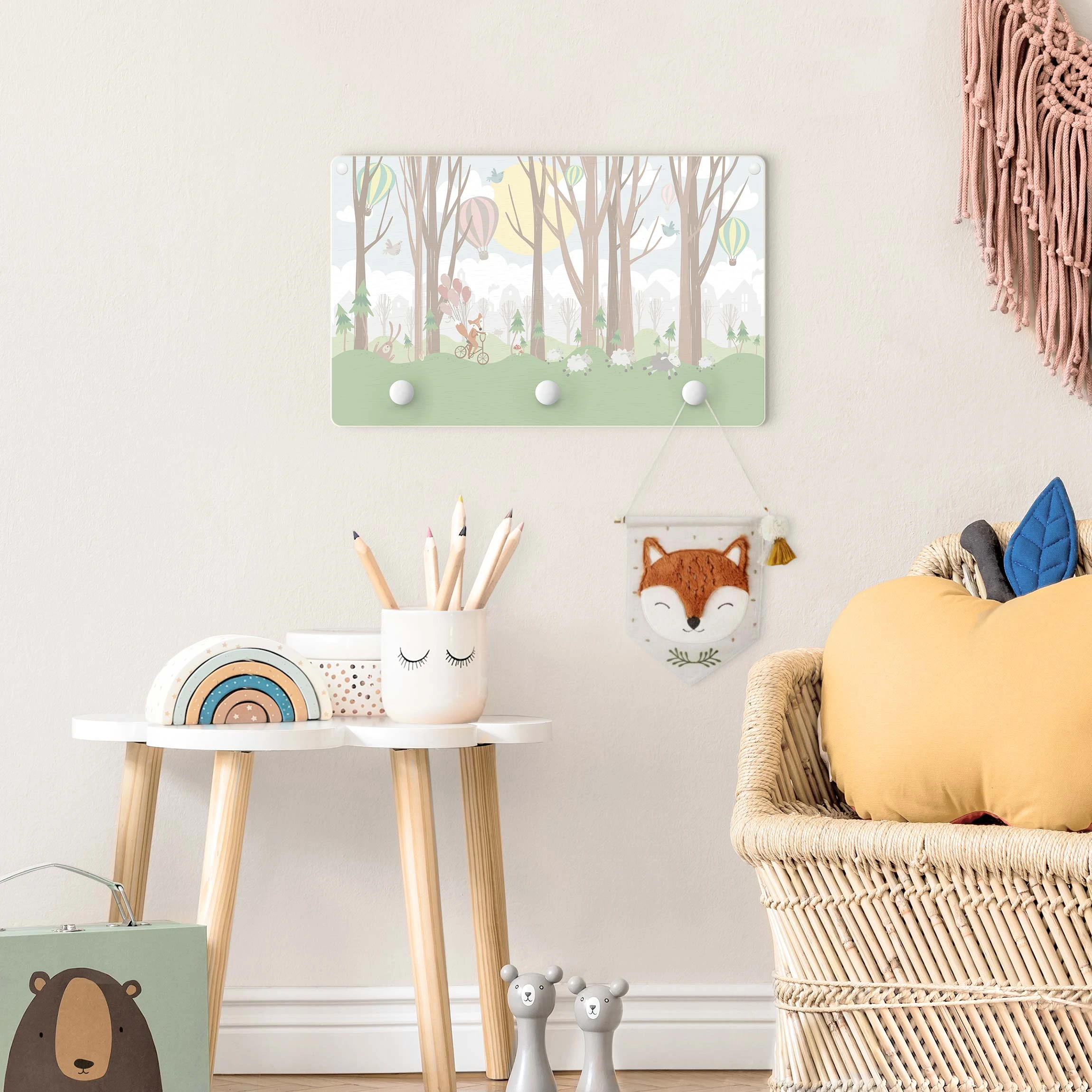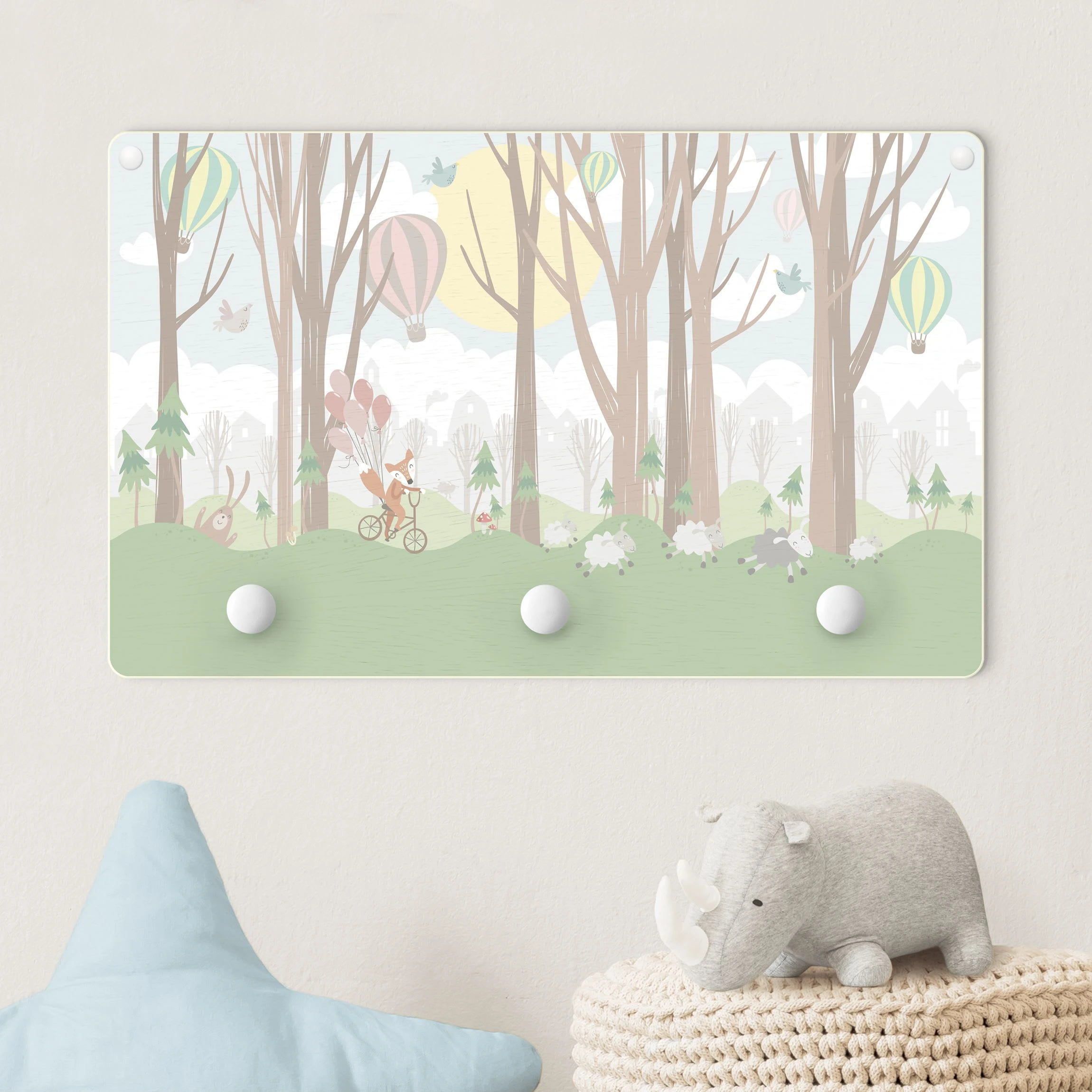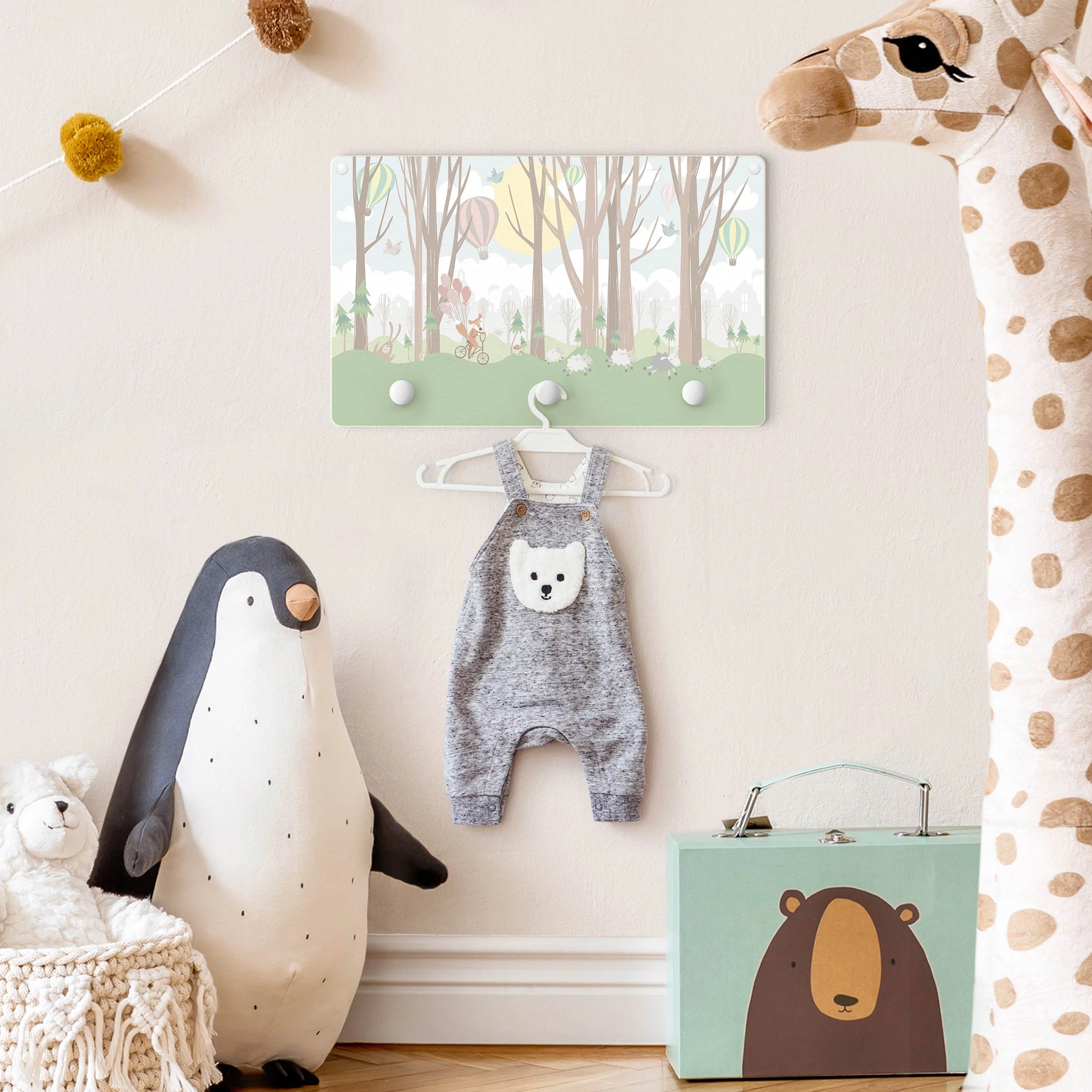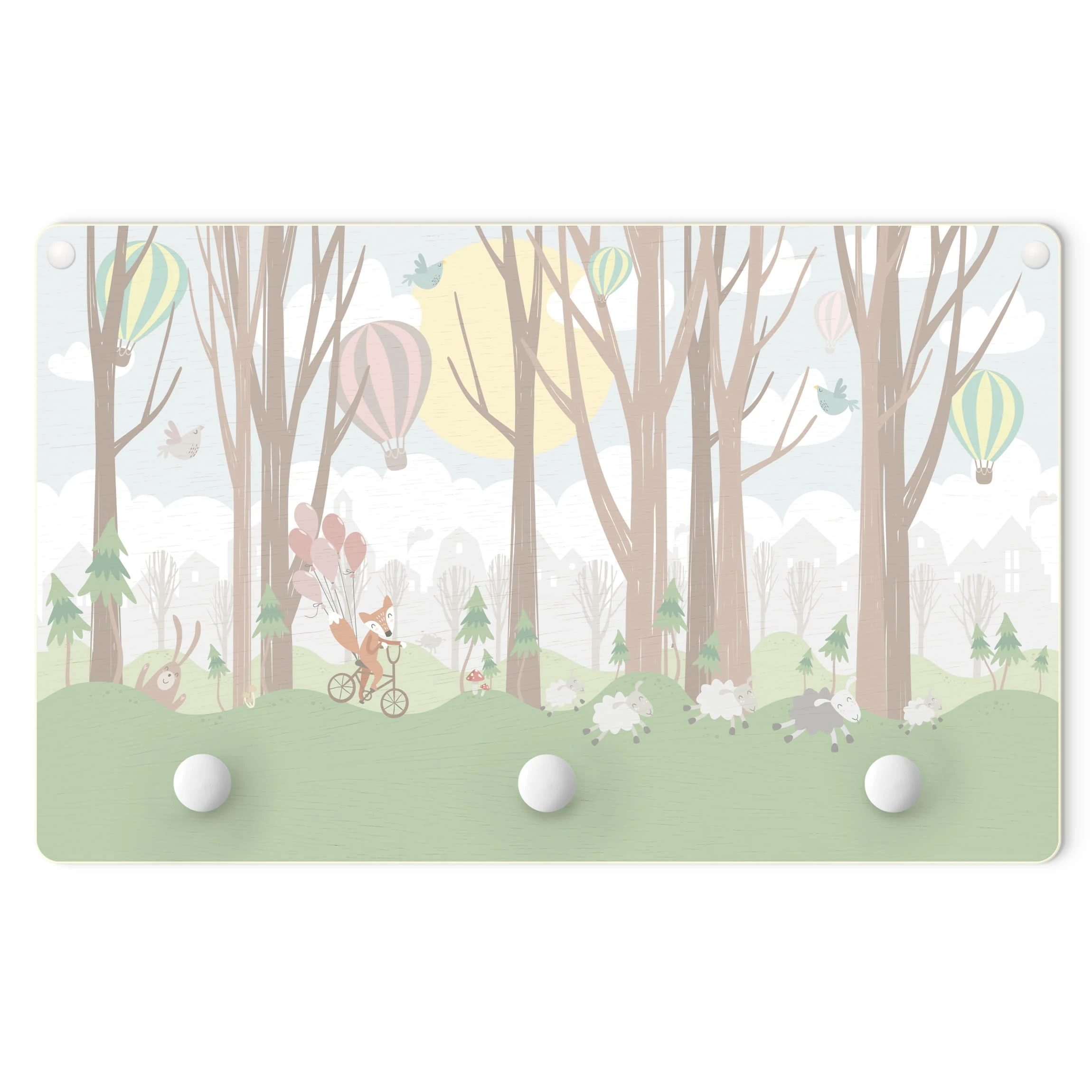 WallArt Kindergarderobe Holz – Sonne Mit Bäumen Und Heißluftballons In Grün