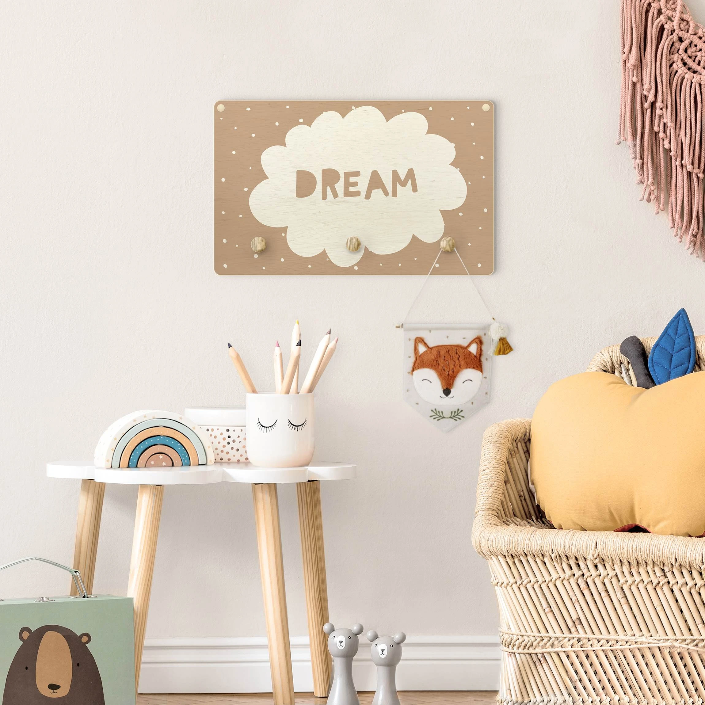 WallArt Kindergarderobe Holz – Spruch Dream Mit Wolke Natur In Creme-Beige