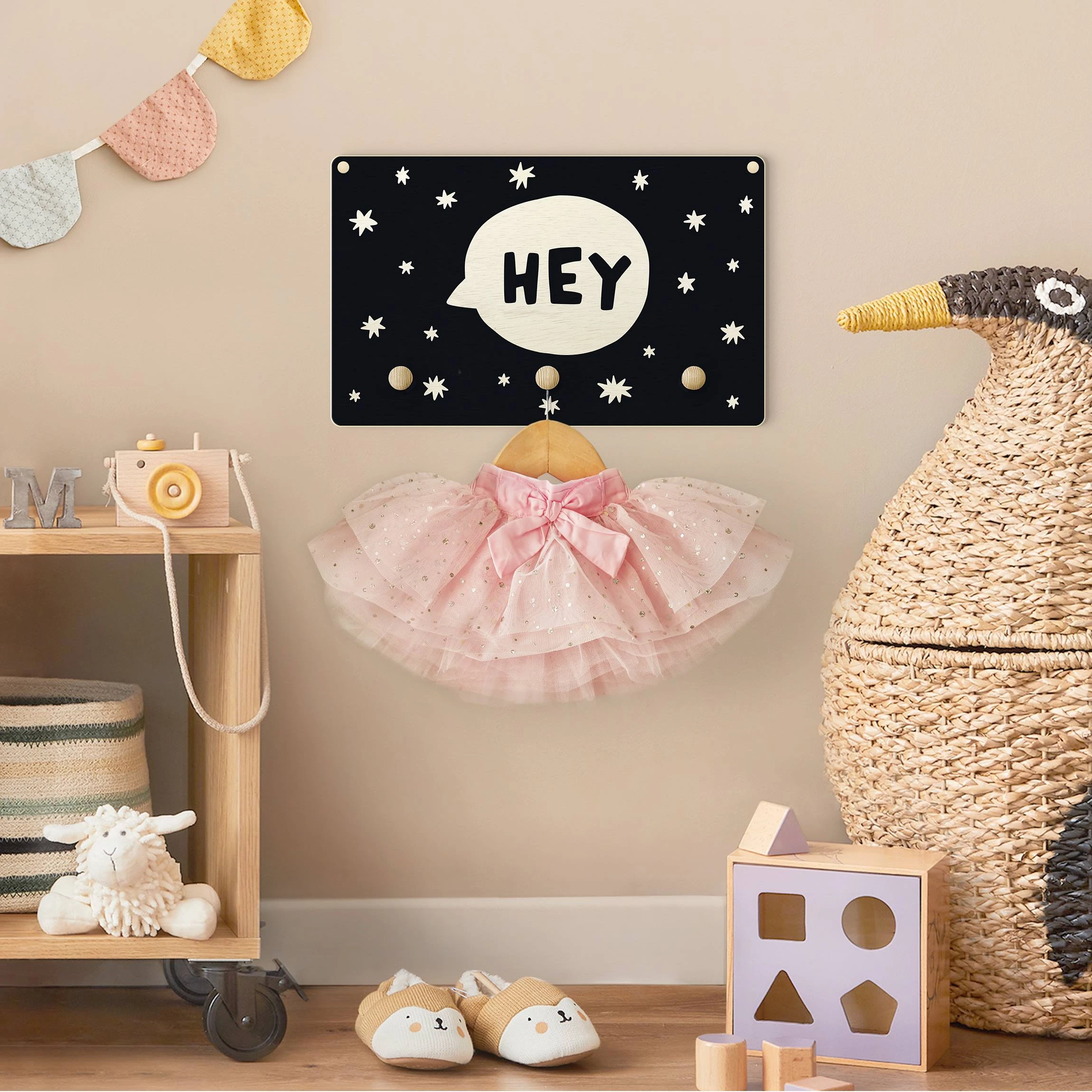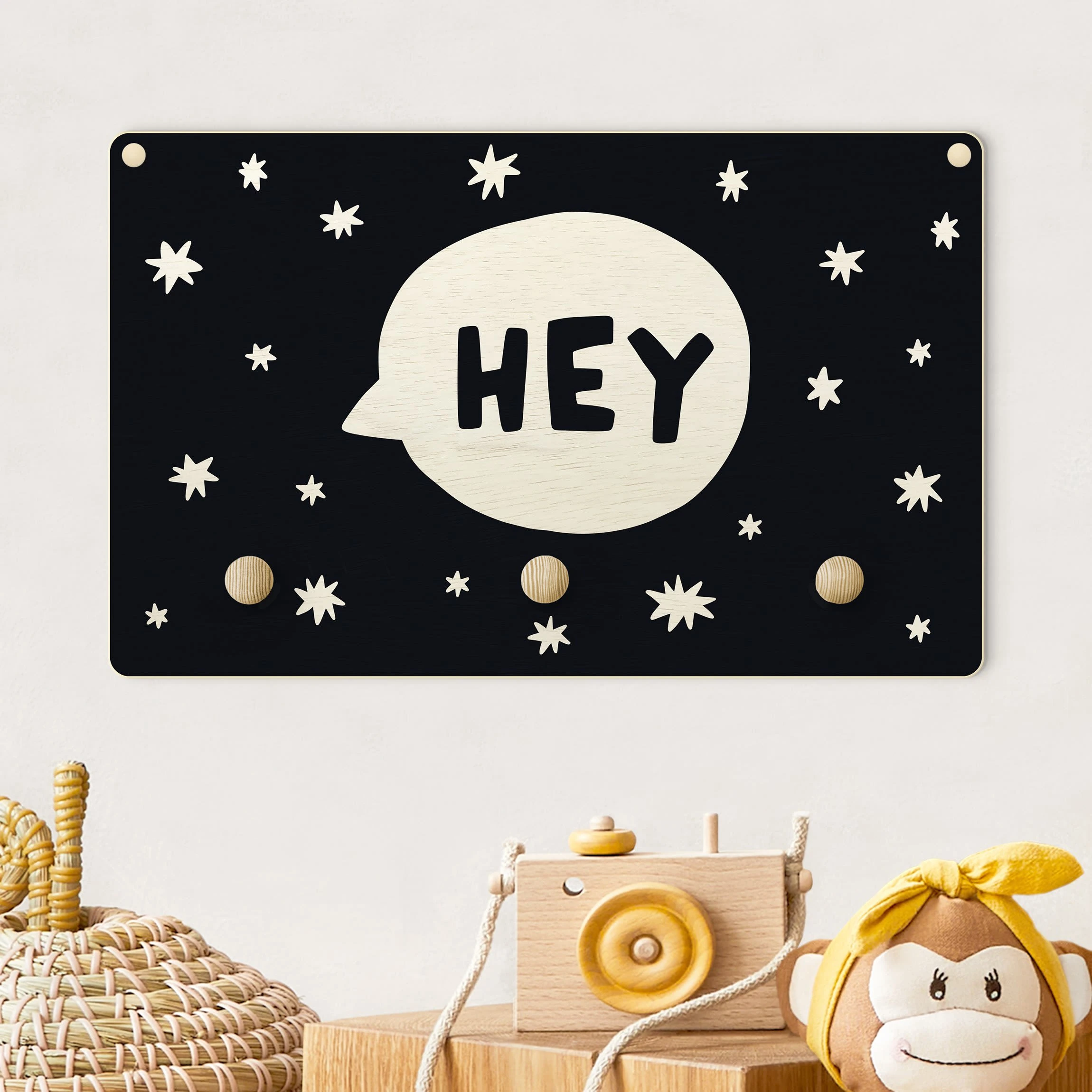 WallArt Kindergarderobe Holz – Spruch Hey In Sprechblase Schwarz In Schwarz-Weiß
