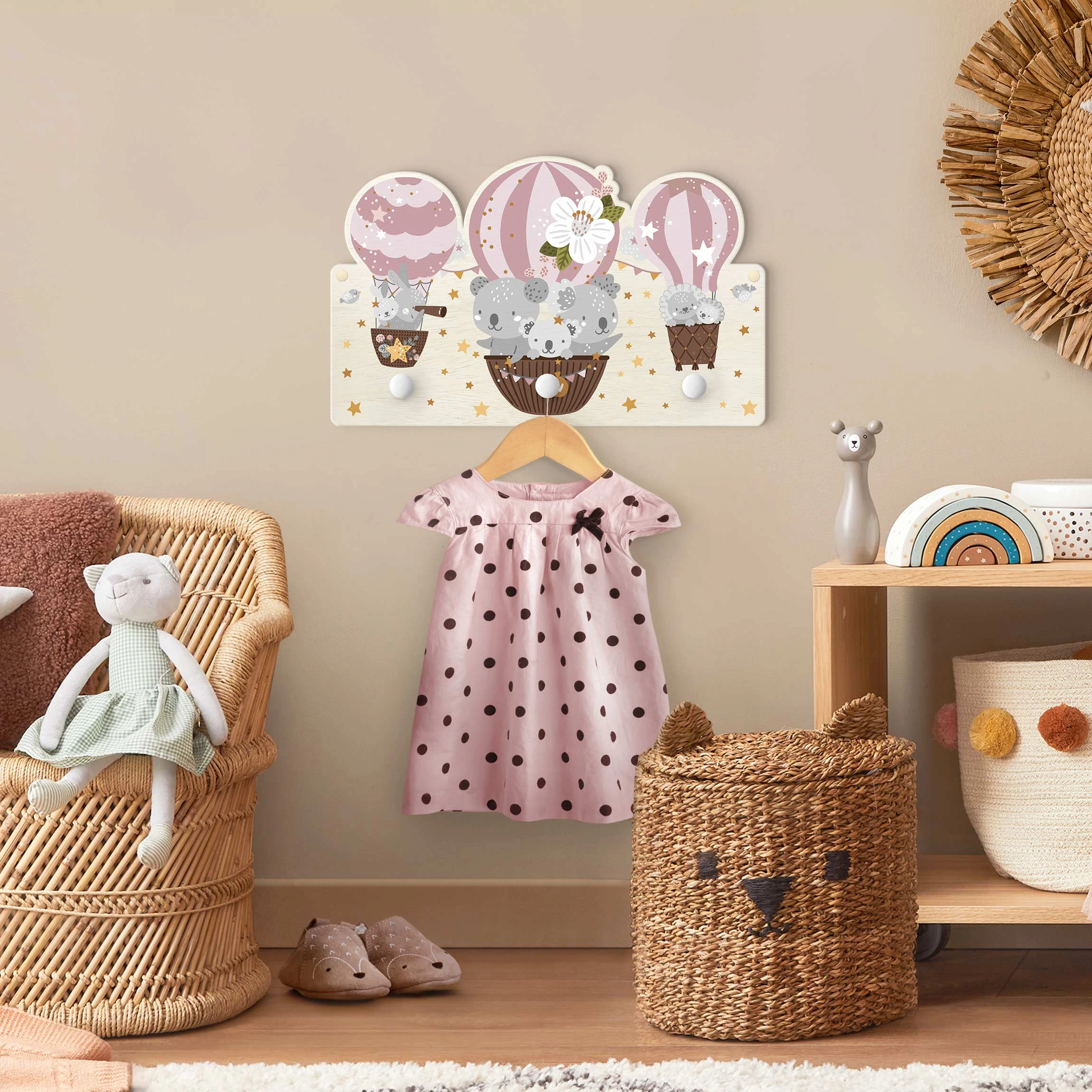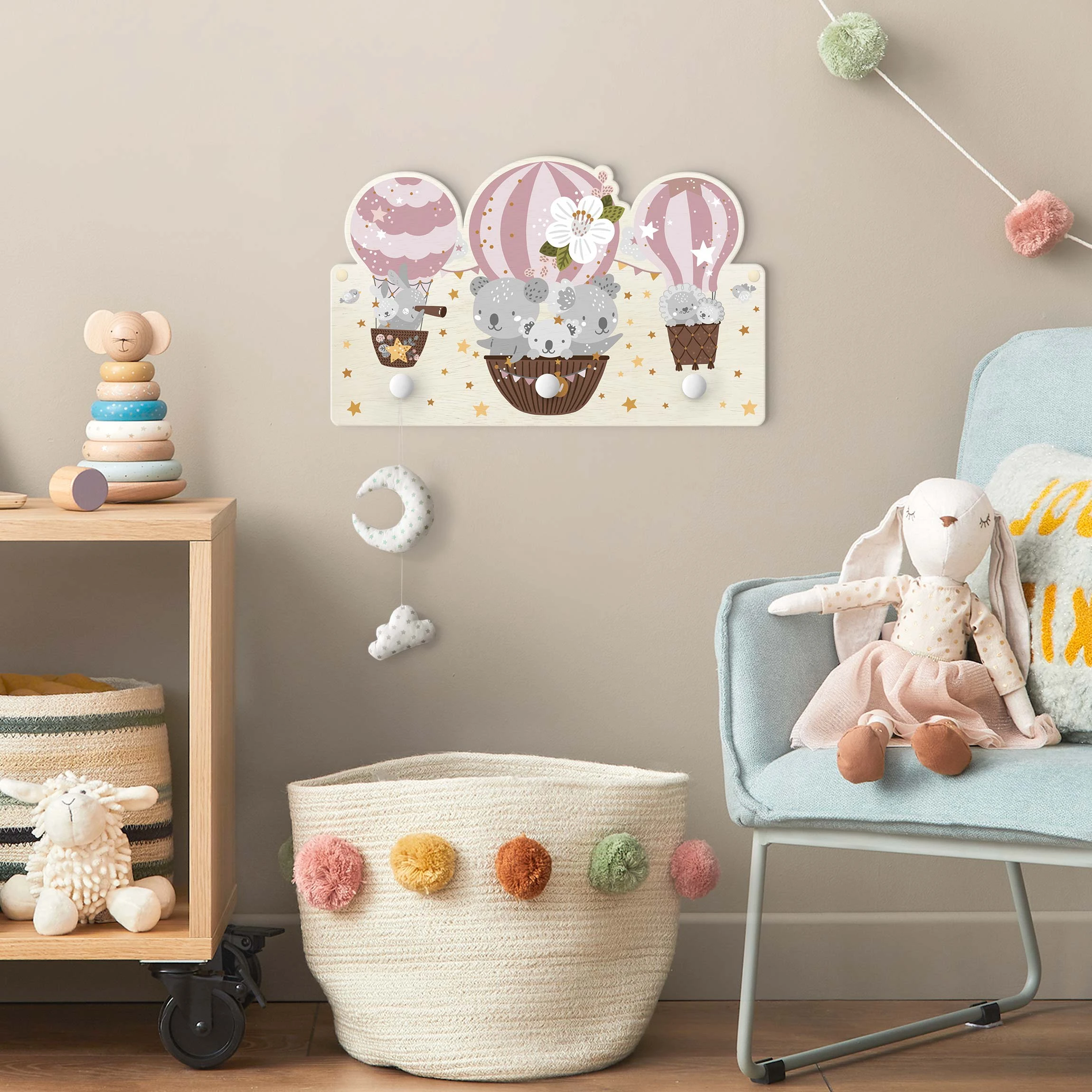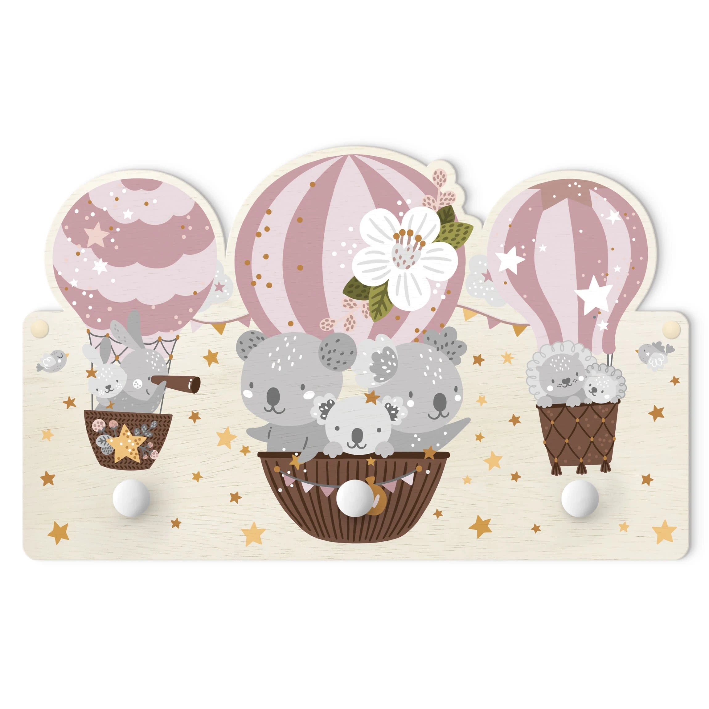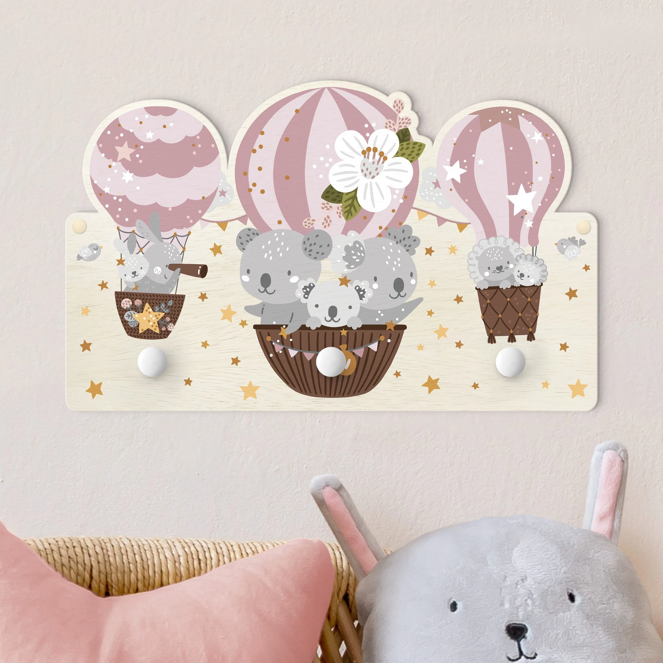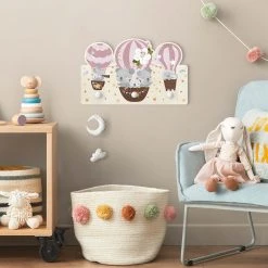 WallArt Kindergarderobe Holz – Tiere In Ballons Wolken Sterne Rosa In Rosa