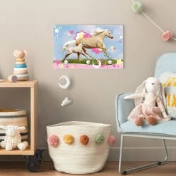 WallArt Kindergarderobe Holz – Zwei Galoppierende Pferde Mit Sternen In Bunt