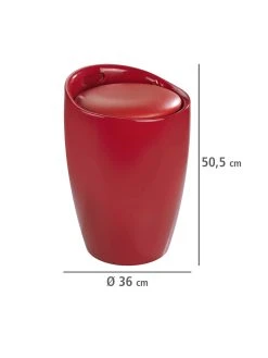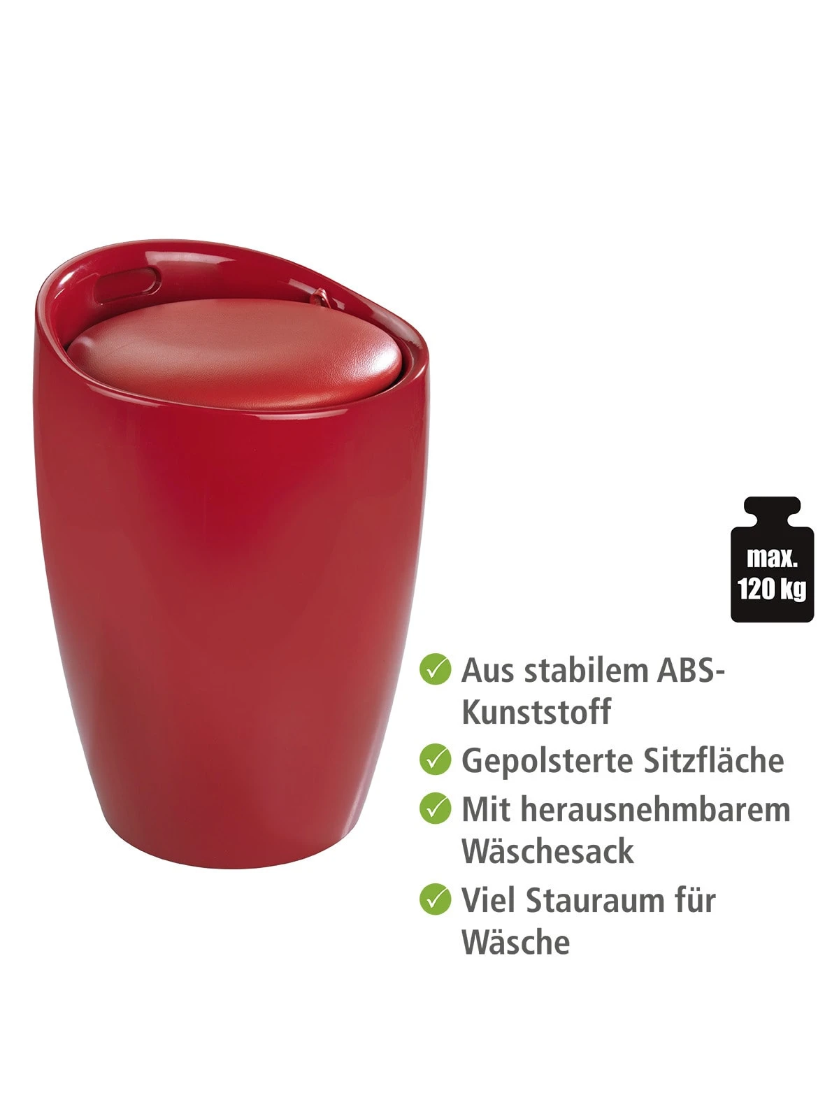 Der trendige Badhocker und Wäschesammler Candy ist aus stabilem ABS-Kunststoff gefertigt. Mit seinem farbenfrohen Rot wird das moderne Accessoire zum Hingucker in jedem Bad.