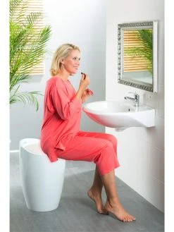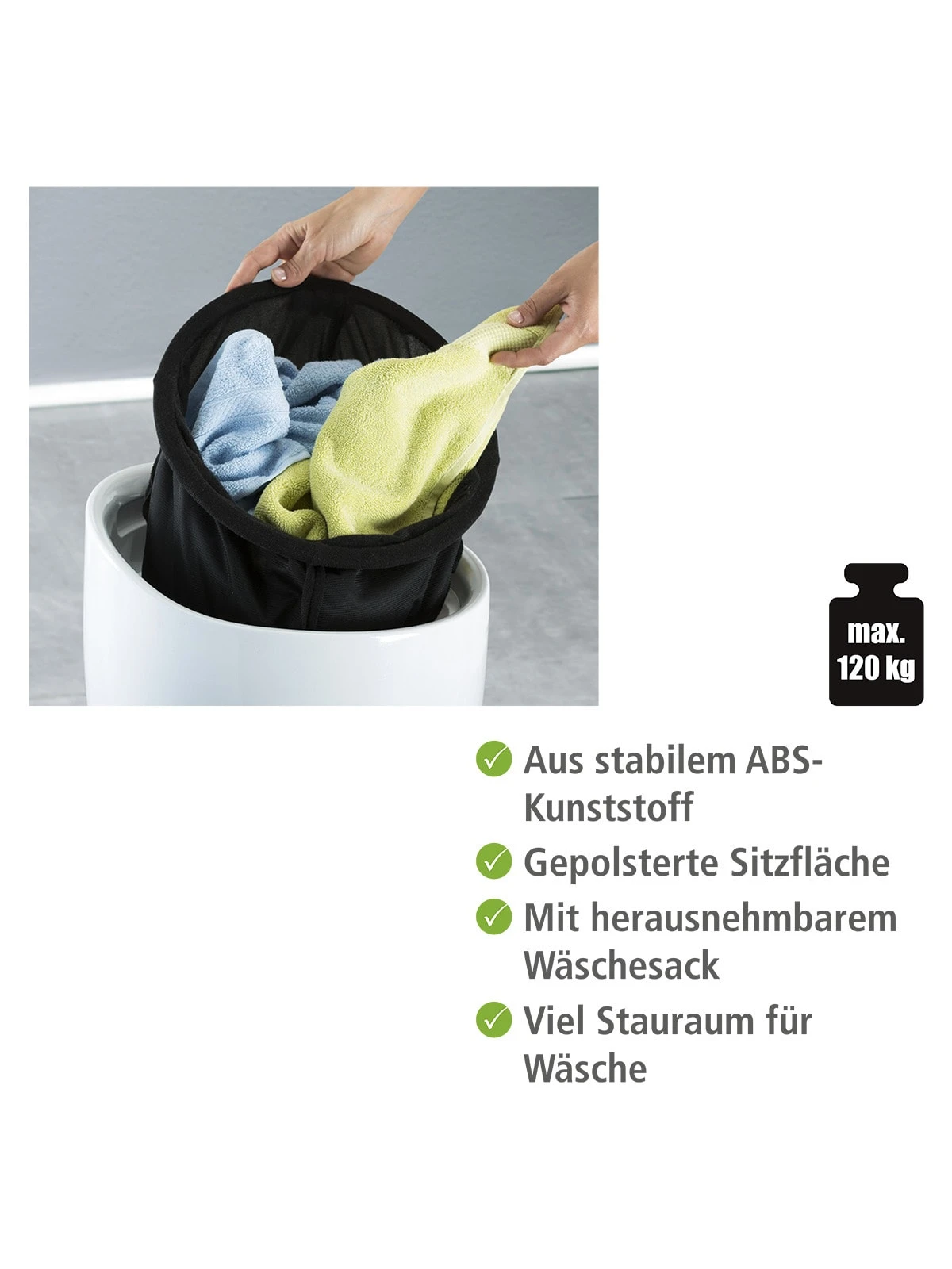 Viel Stauraum für Wäsche bietet der praktische Badhocker unter der Sitzfläche. In dem herausnehmbaren Wäschesack finden dekorativ 20 Liter Wäsche Platz bis zum nächsten Waschgang. Die großzügige, gepolsterte Sitzfläche lädt jederzeit zum Sitzen ein. Ebenso ist der Hocker auch als Ablagefläche geeignet.