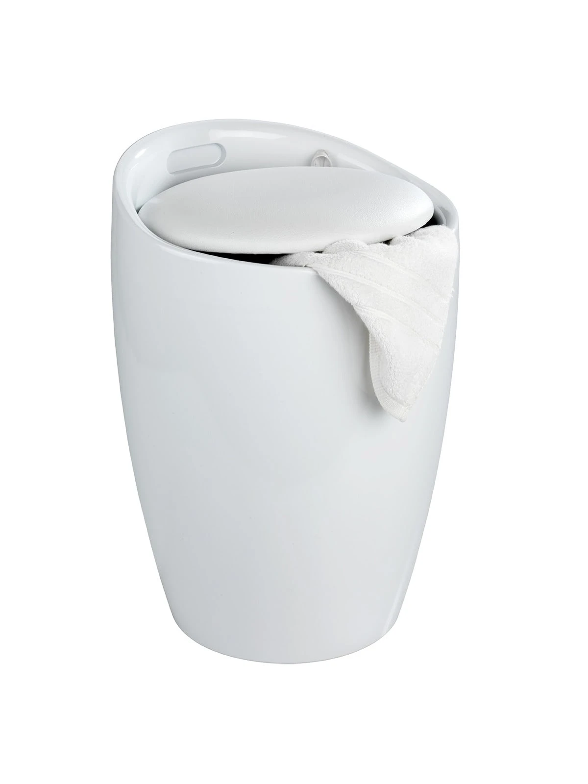 Der trendige Badhocker und Wäschesammler Candy ist aus stabilem ABS-Kunststoff gefertigt. Mit seinem klassischen Weiß wird das moderne Accessoire zum Hingucker in jedem Bad.